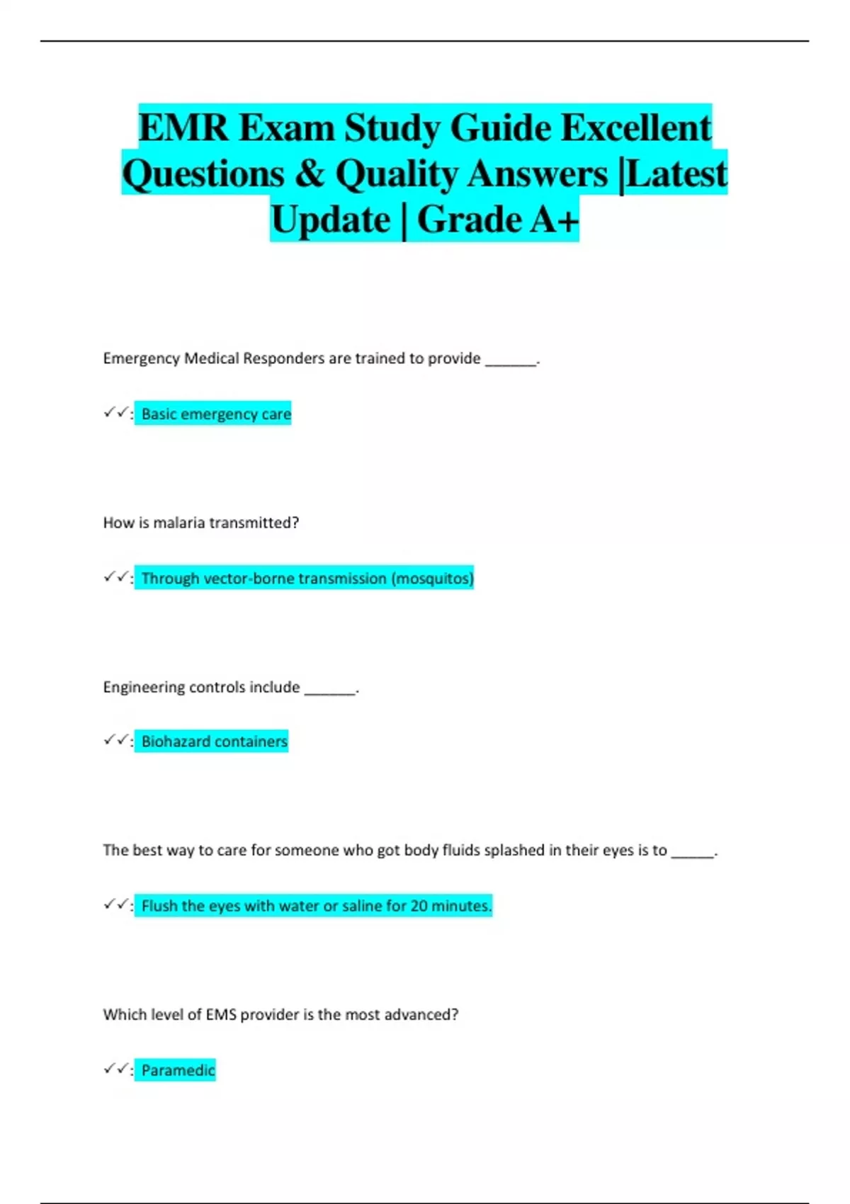 EMR Exam Study Guide Excellent Questions & Quality Answers |Latest Update | Grade A+