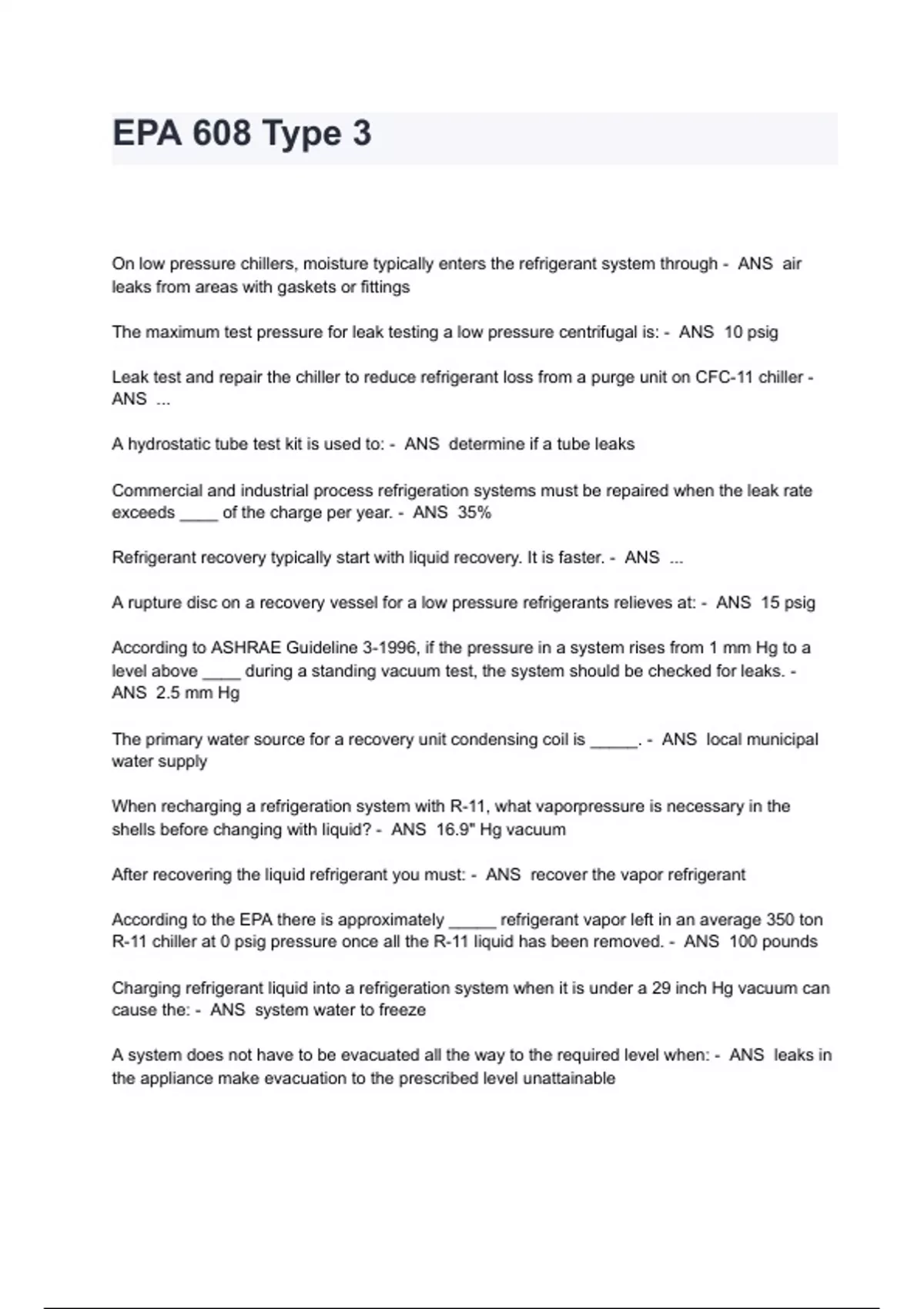EPA 608 Type 3 Exam Questions And Answers On low pressure chillers, moisture typically enters the refrigerant system through - ANS air leaks from areas with gaskets or fittings The maximum test pressure for leak testing a low pressure centrifugal is: - ANS 10 psig Leak test and repair the chiller to reduce refrigerant loss from a purge unit on CFC-11 chiller - ANS ... A hydrostatic tube test kit is used to: - ANS determine if a tube leaks Commercial and industrial process refrigeration systems must be repaired when the leak rate exceeds ____ of the charge per year. - ANS 35% Refrigerant recovery typically start with liquid recovery. It is faster. - ANS ... A rupture disc on a recovery vessel for a low pressure refrigerants relieves at: - ANS 15 psig According to ASHRAE Guideline 3-1996, if the pressure in a system rises from 1 mm Hg to a level above ____ during a standing vacuum test, the system should be checked for leaks. - ANS 2.5 mm Hg The primary water source for a recovery unit condensing coil is _____. - ANS local municipal water supply When recharging a refrigeration system with R-11, what vaporpressure is necessary in the shells before changing with liquid? - ANS 16.9" Hg vacuum After recovering the liquid refrigerant you must: - ANS recover the vapor refrigerant According to the EPA there is approximately _____ refrigerant vapor left in an average 350 ton R-11 chiller at 0 psig pressure