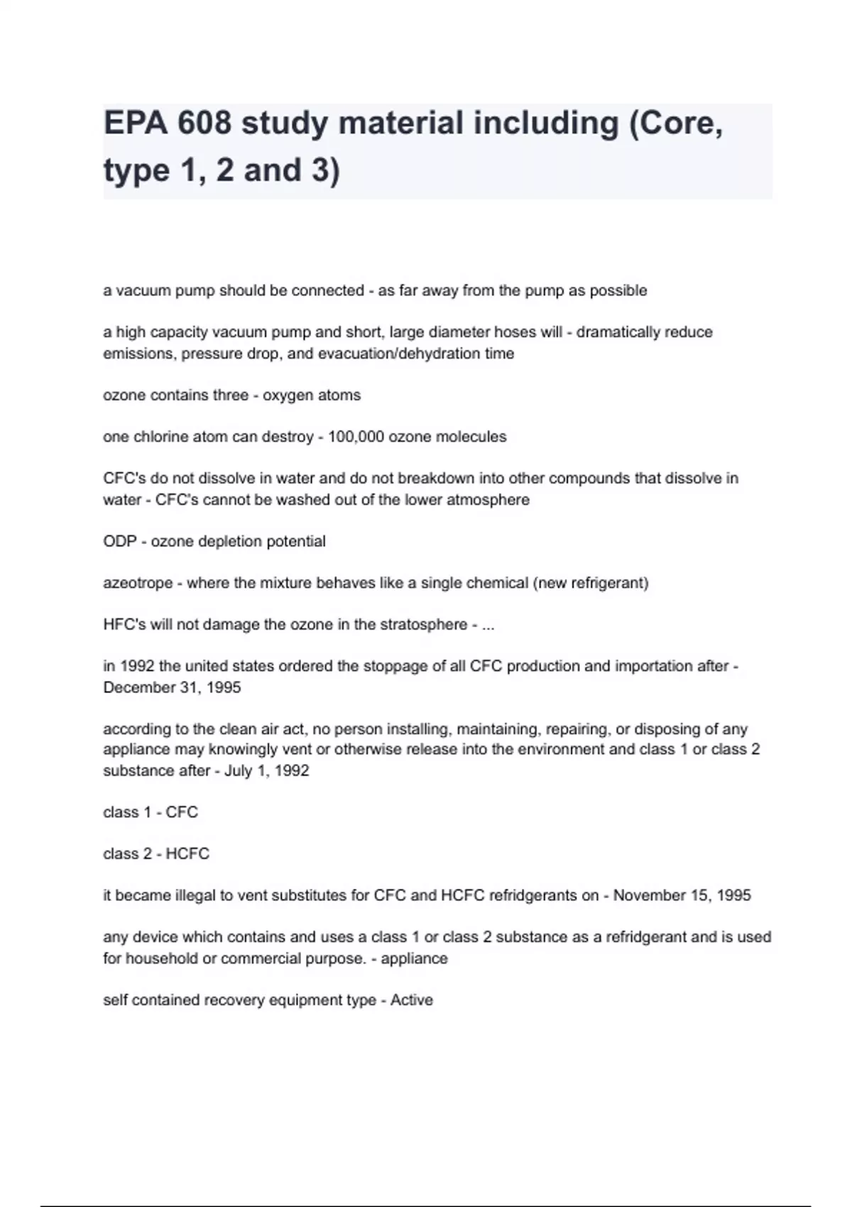 EPA 608 study material including (Core, type 1, 2 and 3) Exam Questions And Answers a vacuum pump should be connected - as far away from the pump as possible a high capacity vacuum pump and short, large diameter hoses will - dramatically reduce emissions, pressure drop, and evacuation/dehydration time ozone contains three - oxygen atoms one chlorine atom can destroy - 100,000 ozone molecules CFC's do not dissolve in water and do not breakdown into other compounds that dissolve in water - CFC's cannot be washed out of the lower atmosphere ODP - ozone depletion potential azeotrope - where the mixture behaves like a single chemical (new refrigerant) HFC's will not damage the ozone in the stratosphere - ... in 1992 the united states ordered the stoppage of all CFC production and importation after - December 31, 1995 according to the clean air act, no person installing, maintaining, repairing, or disposing of any appliance may knowingly vent or otherwise release into the environment and class 1 or class 2 substance after - July 1, 1992 class 1 - CFC