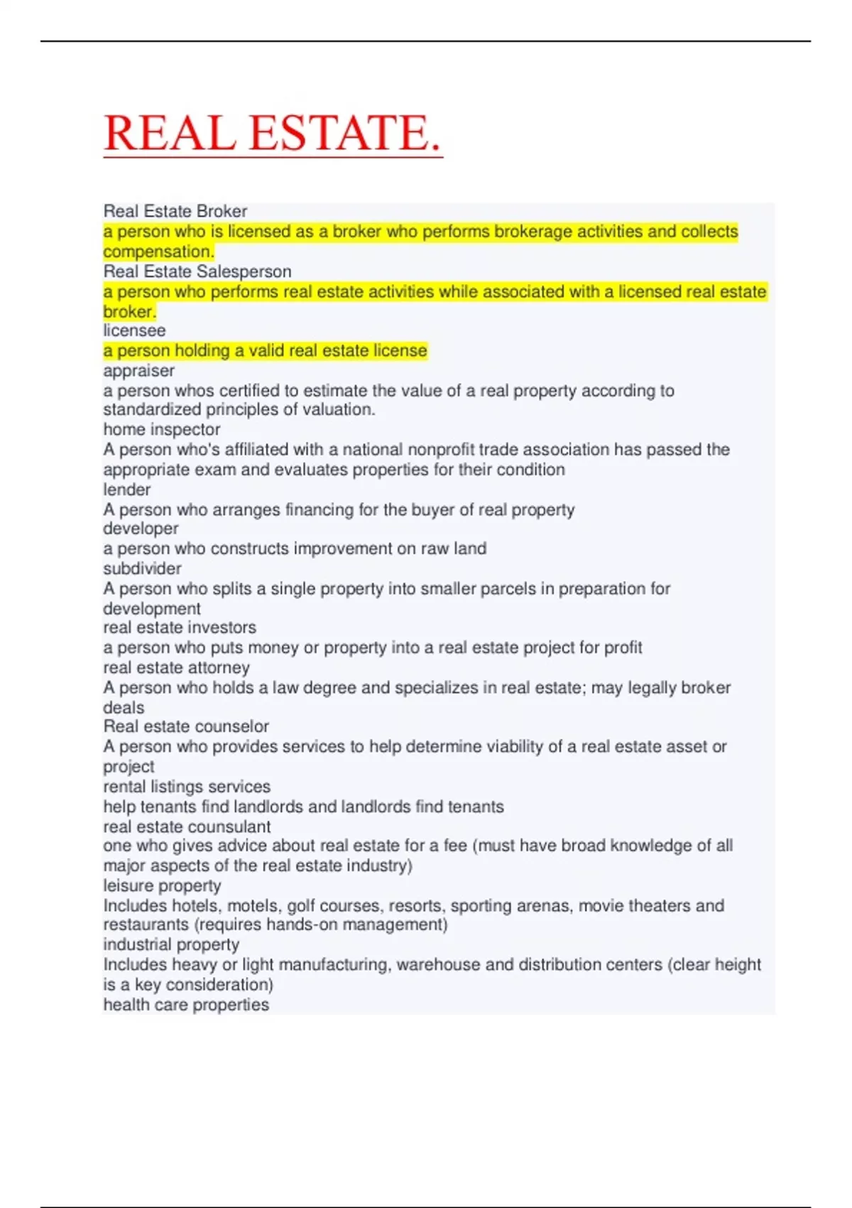 A person who arranges financing for the buyer of real property developer a person who constructs improvement on raw land subdivider A person who splits a single property into smaller parcels in preparation for development real estate investors a person who puts money or property into a real estate project for profit real estate attorney A person who holds a law degree and specializes in real estate; may legally broker deals Real estate counselor A person who provides services to help determine viability of a real estate asset or project rental listings services help tenants find landlords and landlords find tenants real estate counsulant one who gives advice about real estate for a fee (must have broad knowledge of all major aspects of the real estate industry) leisure property Includes hotels, motels, golf courses, resorts, sporting arenas, movie theaters and restaurants (requires hands-on management) industrial property Includes heavy or light manufacturing, warehouse and distribution centers (clear height is a key consideration) health care properties