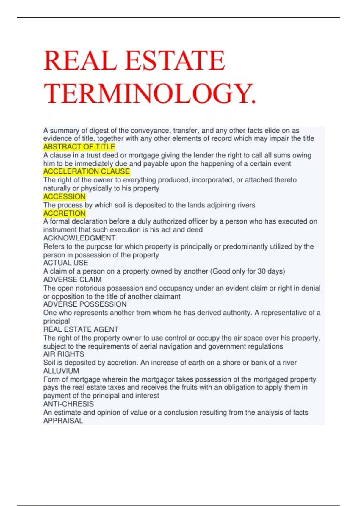 ACKNOWLEDGMENT Refers to the purpose for which property is principally or predominantly utilized by the person in possession of the property ACTUAL USE A claim of a person on a property owned by another (Good only for 30 days) ADVERSE CLAIM The open notorious possession and occupancy under an evident claim or right in denial or opposition to the title of another claimant ADVERSE POSSESSION One who represents another from whom he has derived authority. A representative of a principal REAL ESTATE AGENT The right of the property owner to use control or occupy the air space over his property, subject to the requirements of aerial navigation and government regulations AIR RIGHTS Soil is deposited by accretion. An increase of earth on a shore or bank of a river ALLUVIUM Form of mortgage wherein the mortgagor takes possession of the mortgaged property pays the real estate taxes and receives the fruits with an obligation to apply them in payment of the principal and interest ANTI-CHRESIS An estimate and opinion of value or a conclusion resulting from the analysis of facts APPRAISAL