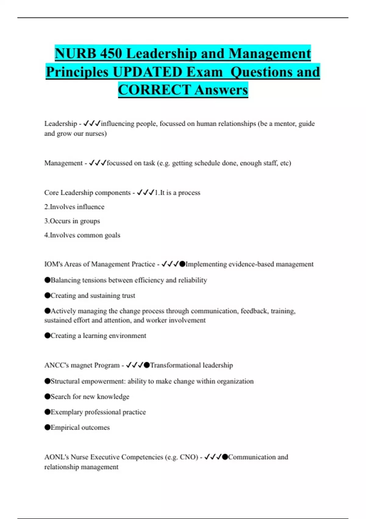 NURB 450 Leadership and Management Principles UPDATED Exam Questions and CORRECT Answers