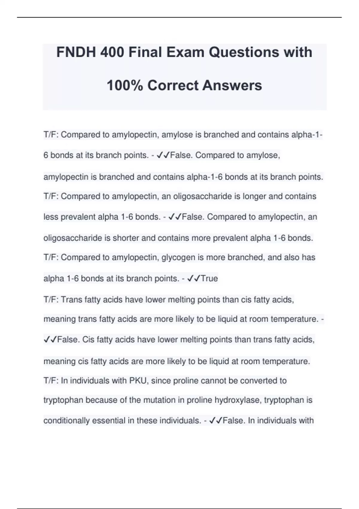 FNDH 400 Final Exam Questions with 100% Correct Answers T/F: Compared to amylopectin, amylose is branched and contains alpha-1- 6 bonds at its branch points. - False. Compared to amylose, amylopectin is branched and contains alpha-1-6 bonds at its branch points. T/F: Compared to amylopectin, an oligosaccharide is longer and contains less prevalent alpha 1-6 bonds. - False. Compared to amylopectin, an oligosaccharide is shorter and contains more prevalent alpha 1-6 bonds. T/F: Compared to amylopectin, glycogen is more branched, and also has alpha 1-6 bonds at its branch points. - True T/F: Trans fatty acids have lower melting points than cis fatty acids, meaning trans fatty acids are more likely to be liquid at room temperature. - False. Cis fatty acids have lower melting points than trans fatty acids, meaning cis fatty acids are more likely to be liquid at room temperature. T/F: In individuals with PKU, since proline cannot be converted to tryptophan because of the mutation in proline hydroxylase, tryptophan is conditionally essential in these individuals. - False. In individuals with