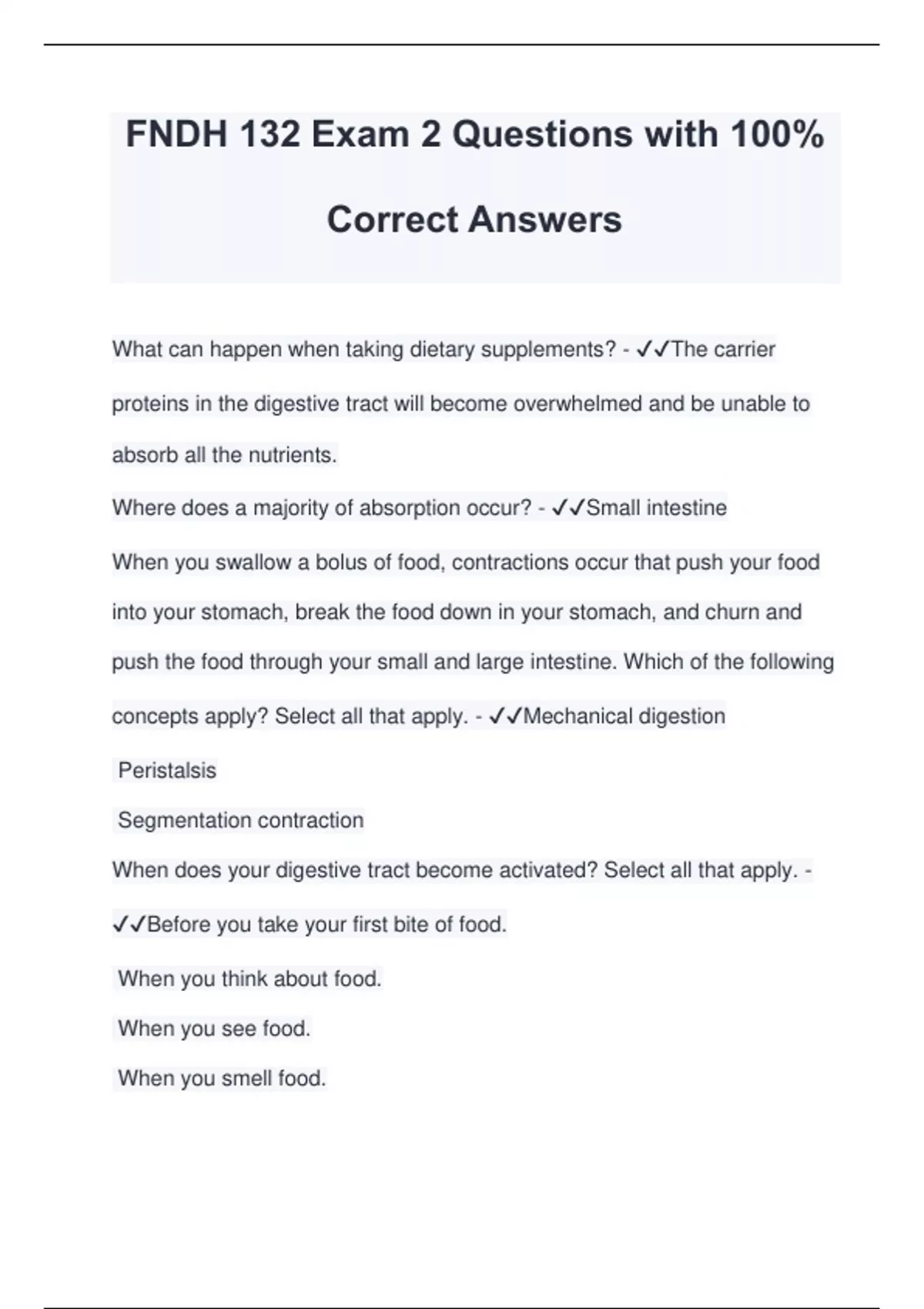 FNDH 132 Exam 2 Questions with 100% Correct Answers What can happen when taking dietary supplements? - The carrier proteins in the digestive tract will become overwhelmed and be unable to absorb all the nutrients. Where does a majority of absorption occur? - Small intestine When you swallow a bolus of food, contractions occur that push your food into your stomach, break the food down in your stomach, and churn and push the food through your small and large intestine. Which of the following concepts apply? Select all that apply. - Mechanical digestion Peristalsis Segmentation contraction When does your digestive tract become activated? Select all that apply. - Before you take your first bite of food. When you think about food. When you see food. When you smell food.