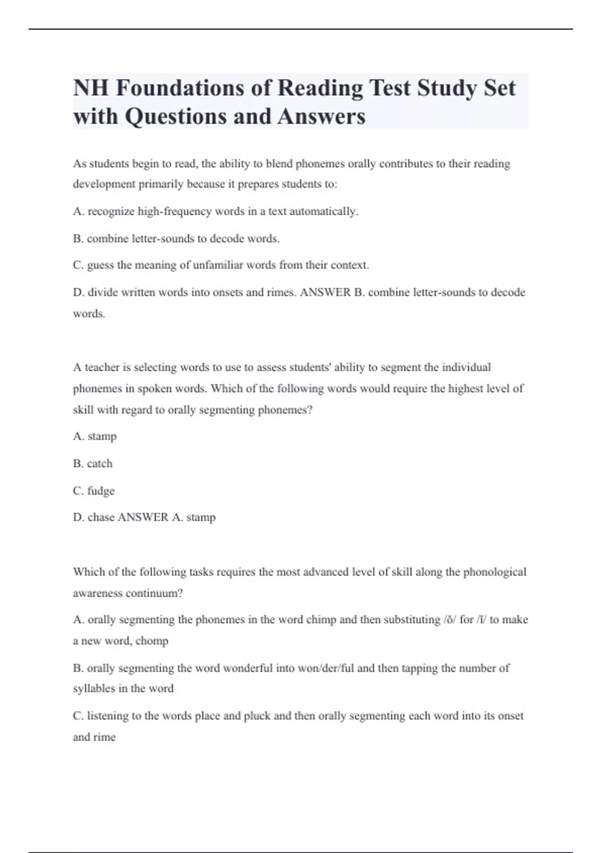 NH Foundations of Reading Test Study Set with Questions and Answers As students begin to read, the ability to blend phonemes orally contributes to their reading development primarily because it prepares students to: A. recognize high-frequency words in a text automatically. B. combine letter-sounds to decode words. C. guess the meaning of unfamiliar words from their context. D. divide written words into onsets and rimes. ANSWER B. combine letter-sounds to decode words. A teacher is selecting words to use to assess students' ability to segment the individual phonemes in spoken words. Which of the following words would require the highest level of skill with regard to orally segmenting phonemes? A. stamp B. catch C. fudge D. chase ANSWER A. stamp Which of the following tasks requires the most advanced level of skill along the phonological awareness continuum? A. orally segmenting the phonemes in the word chimp and then substituting /ŏ/ for /ĭ/ to make a new word, chomp B. orally segmenting the word wonderful into won/der/ful and then tapping the number of syllables in the word C. listening to the words place and pluck and then orally segmenting each word into its onset and rime