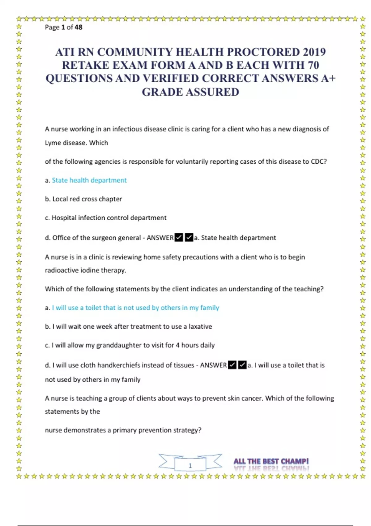 ATI RN COMMUNITY HEALTH PROCTORED 2019 RETAKE EXAM FORM A AND B EACH WITH 70 QUESTIONS AND VERIFIED CORRECT ANSWERS A+ GRADE ASSURED