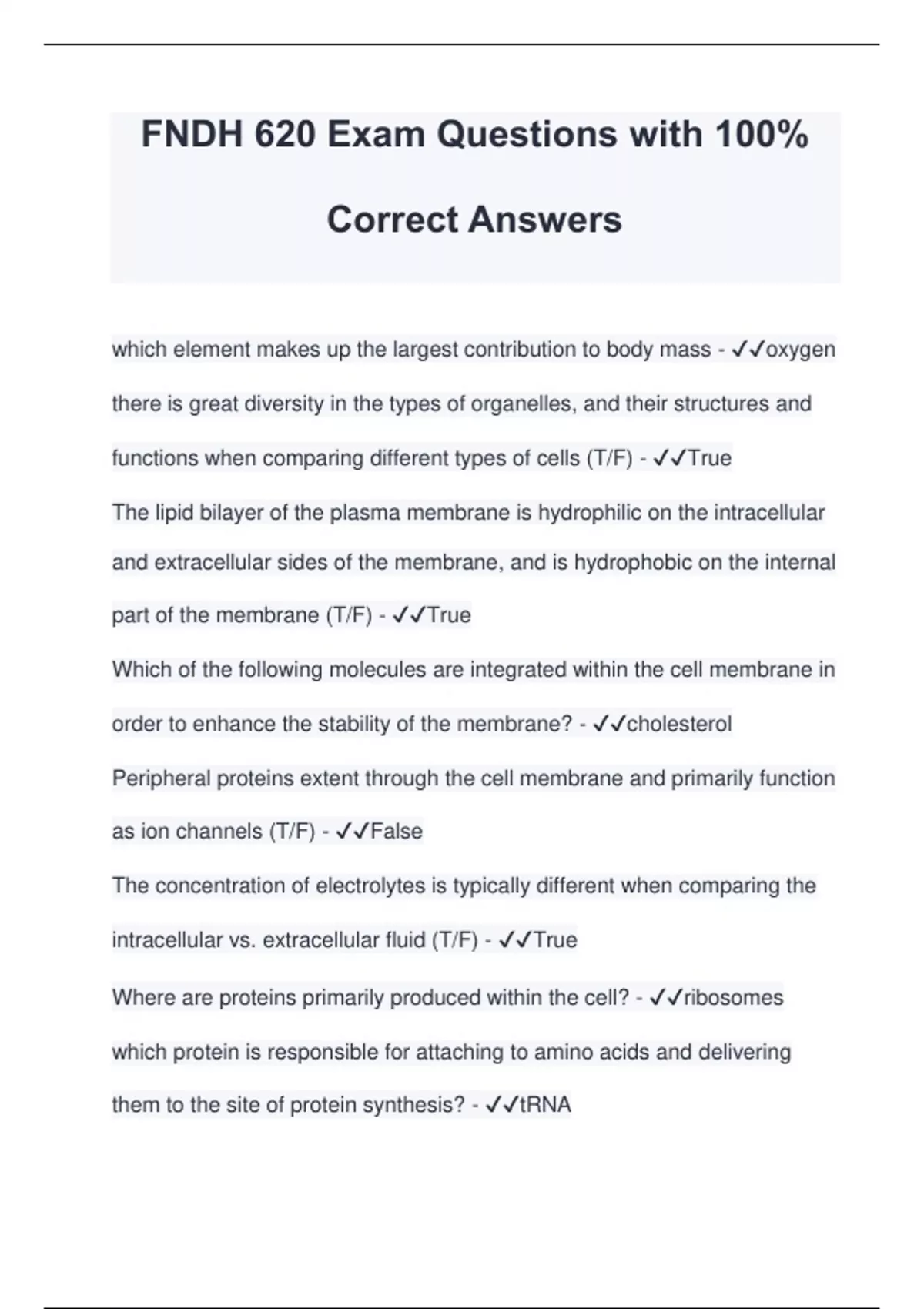 FNDH 620 Exam Questions with 100% Correct Answers which element makes up the largest contribution to body mass - oxygen there is great diversity in the types of organelles, and their structures and functions when comparing different types of cells (T/F) - True The lipid bilayer of the plasma membrane is hydrophilic on the intracellular and extracellular sides of the membrane, and is hydrophobic on the internal part of the membrane (T/F) - True Which of the following molecules are integrated within the cell membrane in order to enhance the stability of the membrane? - cholesterol Peripheral proteins extent through the cell membrane and primarily function as ion channels (T/F) - False The concentration of electrolytes is typically different when comparing the intracellular vs. extracellular fluid (T/F) - True Where are proteins primarily produced within the cell? - ribosomes which protein is responsible for attaching to amino acids and delivering them to the site of protein synthesis? - tRNA
