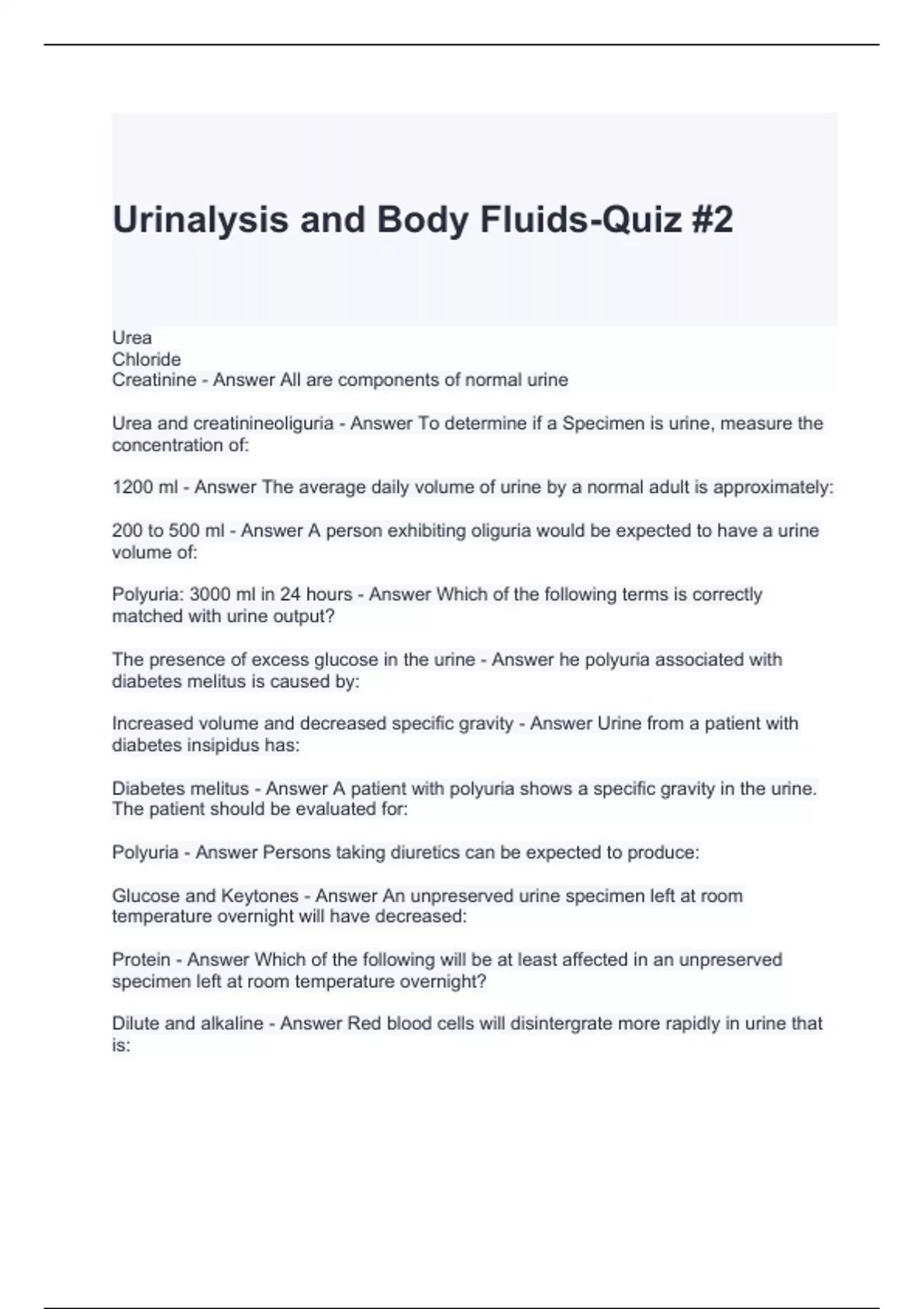 Urinalysis and Body Fluids-Quiz #2 with complete solutions