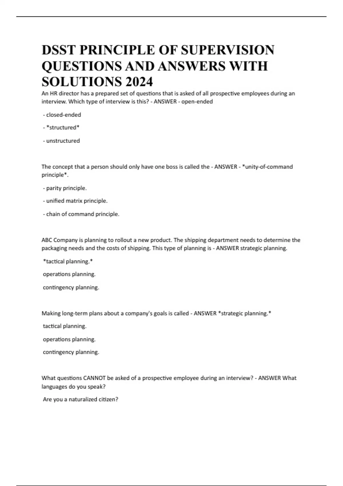 DSST PRINCIPLE OF SUPERVISION QUESTIONS AND ANSWERS WITH SOLUTIONS 2024