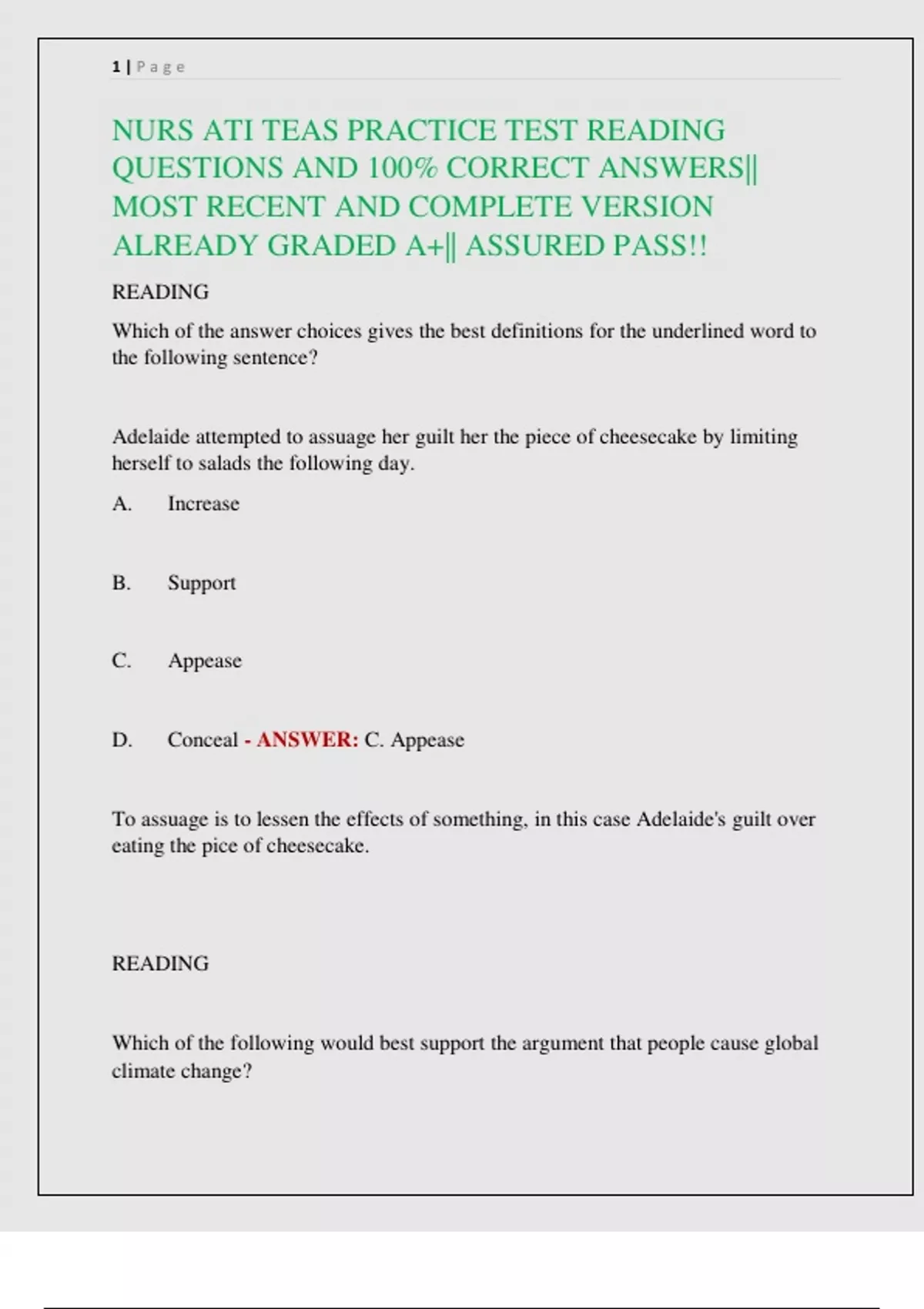 NURS ATI TEAS PRACTICE TEST READING QUESTIONS AND 100% CORRECT ANSWERS|| MOST RECENT AND COMPLETE VERSION ALREADY GRADED A+|| ASSURED PASS!!