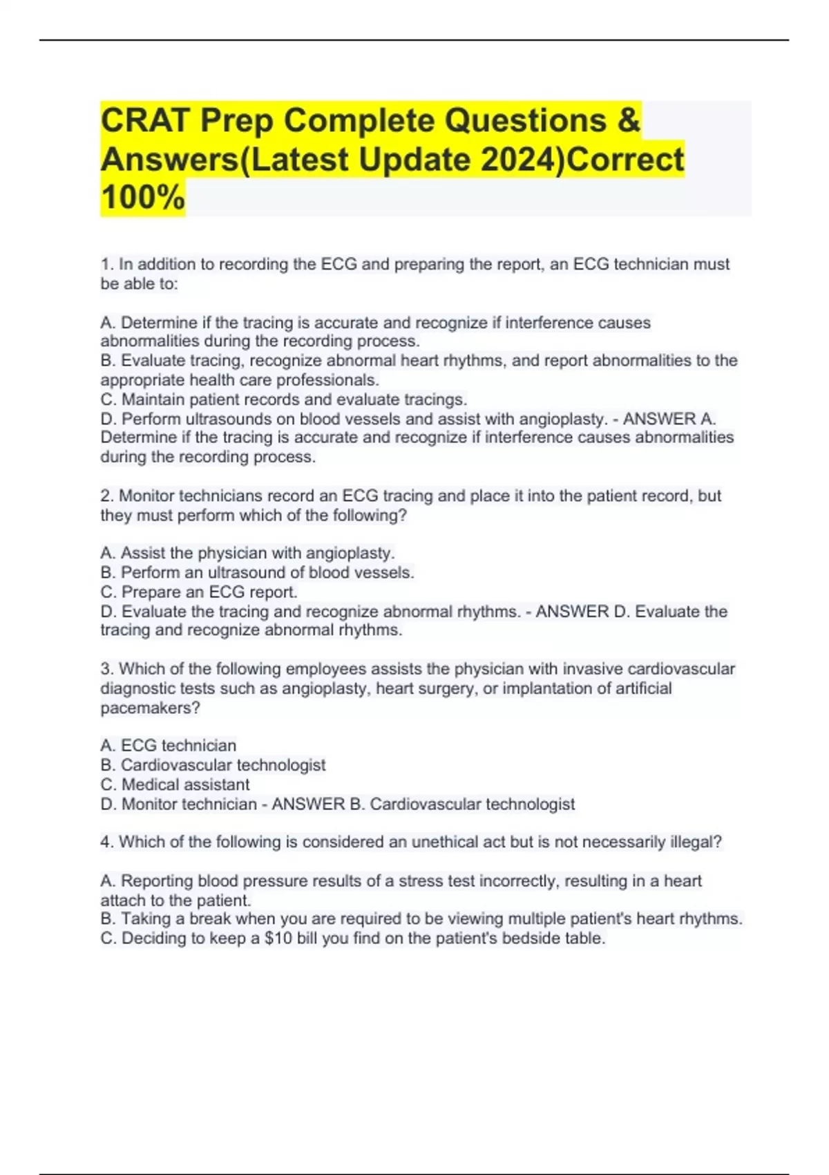 1. In addition to recording the ECG and preparing the report, an ECG technician must be able to: A. Determine if the tracing is accurate and recognize if interference causes abnormalities during the recording process. B. Evaluate tracing, recognize abnormal heart rhythms, and report abnormalities to the appropriate health care professionals. C. Maintain patient records and evaluate tracings. D. Perform ultrasounds on blood vessels and assist with angioplasty. - ANSWER A. Determine if the tracing is accurate and recognize if interference causes abnormalities during the recording process. 2. Monitor technicians record an ECG tracing and place it into the patient record, but they must perform which of the following? A. Assist the physician with angioplasty. B. Perform an ultrasound of blood vessels. C. Prepare an ECG report. D. Evaluate the tracing and recognize abnormal rhythms. - ANSWER D. Evaluate the tracing and recognize abnormal rhythms. 3. Which of the following employees assists the physician with invasive cardiovascular diagnostic tests such as angioplasty, heart surgery, or implantation of artificial pacemakers? A. ECG technician B. Cardiovascular technologist C. Medical assistant D. Monitor technician - ANSWER B. Cardiovascular technologist 4. Which of the following is considered an unethical act but is not necessarily illegal?