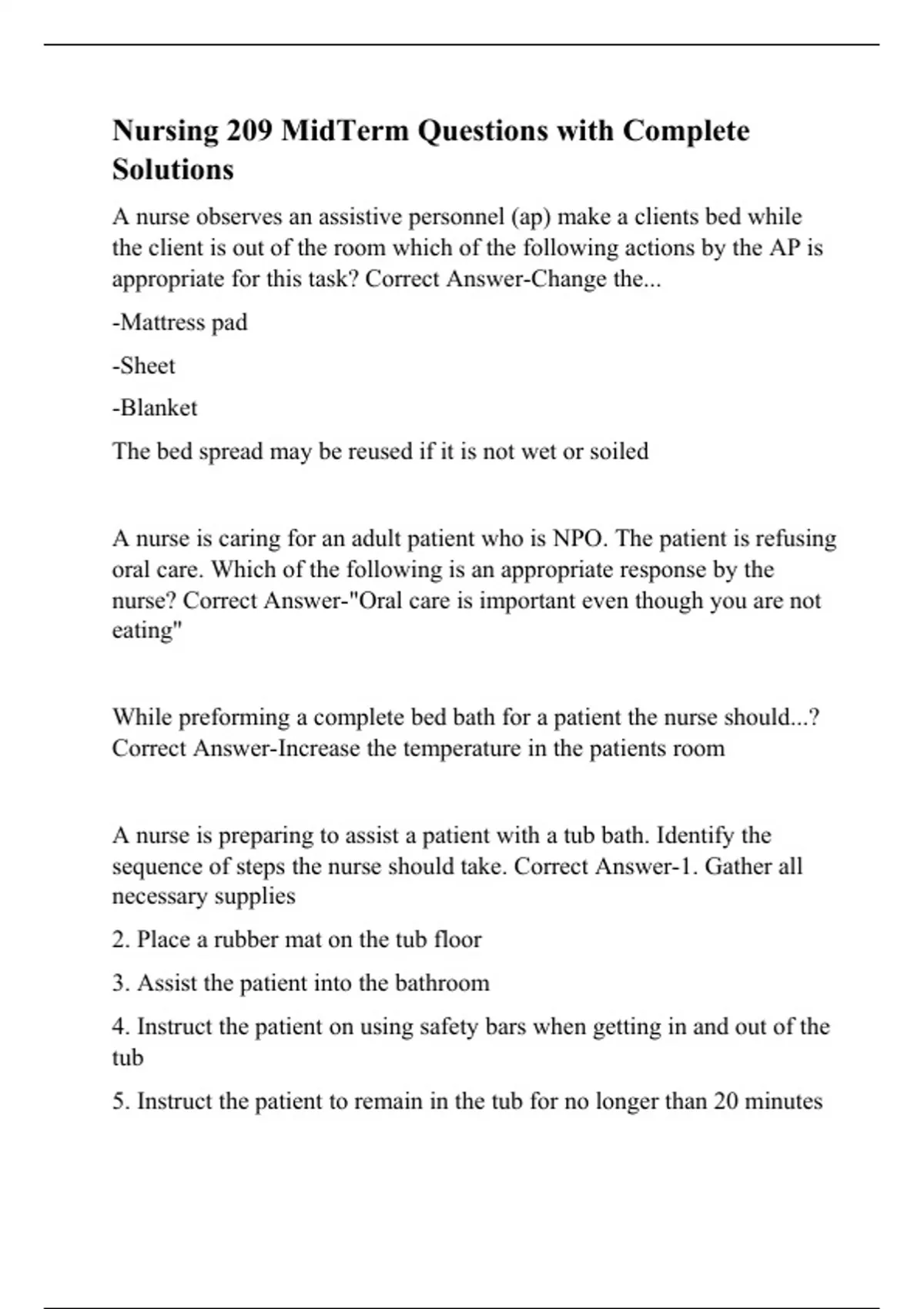 A nurse observes an assistive personnel (ap) make a clients bed while the client is out of the room which of the following actions by the AP is appropriate for this task? Correct Answer-Change the... -Mattress pad -Sheet -Blanket The bed spread may be reused if it is not wet or soiled A nurse is caring for an adult patient who is NPO. The patient is refusing oral care. Which of the following is an appropriate response by the nurse? Correct Answer-"Oral care is important even though you are not eating" While preforming a complete bed bath for a patient the nurse should...? Correct Answer-Increase the temperature in the patients room A nurse is preparing to assist a patient with a tub bath. Identify the sequence of steps the nurse should take. Correct Answer-1. Gather all necessary supplies 2. Place a rubber mat on the tub floor 3. Assist the patient into the bathroom 4. Instruct the patient on using safety bars when getting in and out of the tub