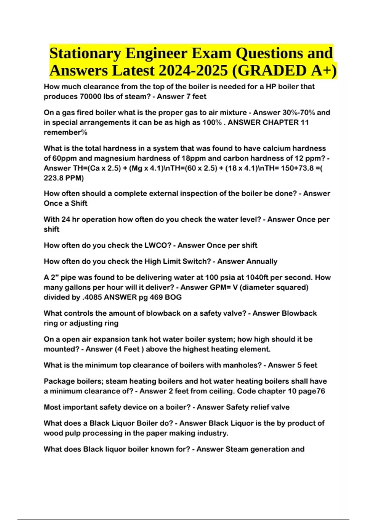 Stationary Engineer Exam Questions With Correct Answers Latest (GRADED A+) On a gas fired boiler what is the proper gas to air mixture - Answer 30%-70% and in special arrangements it can be as high as 100% . ANSWER CHAPTER 11 remember% What is the total hardness in a system that was found to have calcium hardness of 60ppm and magnesium hardness of 18ppm and carbon hardness of 12 ppm? - Answer TH=(Ca x 2.5) + (Mg x 4.1)nTH=(60 x 2.5) + (18 x 4.1)nTH= 150+73.8 =( 223.8 PPM) How often should a complete external inspection of the boiler be done? - Answer Once a Shift With 24 hr operation how often do you check the water level? - Answer Once per shift How often do you check the LWCO? - Answer Once per shift How often do you check the High Limit Switch? - Answer Annually A 2" pipe was found to be delivering water at 100 psia at 1040ft per second. How many gallons per hour will it deliver? - Answer GPM= V (diameter squared) divided by .4085 ANSWER pg 469 BOG What controls the amount of blowback on a safety valve? - Answer Blowback ring or adjusting ring On a open air expansion tank hot water boiler system; how high should it be mounted? - Answer (4 Feet ) above the highest heating element. What is the minimum top clearance of boilers with manholes? - Answer 5 feet Package boilers; steam heating boilers and hot water heating boilers shall have a minimum clearance of? - Answer 2 feet from ceiling. Code chapter 10 page76 Most important safety device on a boiler? - Answer Safety relief valve What does a Black Liquor Boiler do? - Answer Black Liquor is the by product of wood pulp processing in the paper making industry. What does Black liquor boiler known for? - Answer Steam generation and Stationary Engineer Exam Questions and Answers Latest (GRADED A+) recovery of soda ash Maximum line voltage for control on a boiler? - Answer 150 volts Under what code are boilers designed and constructed? - Answer ASME- CSD 1 How many low water cut offs are needed per code for a hot water system when a boiler has inputs greater than 400,000 btu per hr - Answer 1 LWCO is needed. What is the minimum and maximum size for a safety valve per code for boilers? - Answer Minimum 3/4" and Maximum 4 1/2" What stamp is put on a boiler after repairs? - Answer "R" What is the equalizing system used for? - Answer The equalizing system is for warming up the steam lead. A blowdown valve is located at the lowest water space of a boiler for three purposes - Answer 1. to remove precipitated sludge or loose scale n2. To permit rapid lowering of the boiler water if it has become too high accidentally n3. As a means of removing water from the boiler so that fresh water may be added to keep the concentration of solids below the point where difficulties may be experienced. In the old power boiler which type of feed-water regulators were not used? - Answer Electronic After opening a boiler for repairs how much oxygen is needed? - Answer 19% What is the first thing you do when shutting down a boiler? - Answer Turn off (extinguish fire) What is the legal limit of acceptable asbestos particles ? - Answer 0.1 fibers per cubic centimeter What is CREEP? - Answer Creep is defined as the slow deformation of material with time; with the deformation taking place at elevated temperatures with no increase in stress. What is the BTU content of Anthracite coal? - Answer 14000 btu/lb What substance transfers electrical current in a photocell? - Answer Electricity will flow when the CADMIUM is exposed to sufficient light. What device acts as a check valve in both directions and keeps pumps primed? - Answer FOOT VALVES are used for pumps under suction pressure to prevent backflow primed? on the suction line. What protects boilers from explosion in the furnace? - Answer A flame guard system is an arrangement of flame detection system; interlocks; and relays which will sense the presence of a proper flame in a furnace and cause fuel to be shut off to the furnace if a hazardous condition develops (improper flame or combustion). What size pipe is used as a header in a boiler operating at 100psi? - Answer 6 inches What device is used to measure flue gasses - Answer The Orsat Analyzer Which low water cut off does not have a mercury switch? - Answer The Submerged electrode type What is the btu output per lb of #4 fuel oil? - Answer 18 What substance is used for the electric transmission in an RTD? - Answer Platinum is used because of its stability at high temperatures How much air is needed for the combustion of pulverized coal; gas; oil? - Answer 50% for coal and 10-30% for gas & oil In old power boilers which type of feedwater regulators were not used? n(A) hydraulic n(B) float n(C) thermostatic expansion n(D) electronic - Answer ANSWER D electronic/electro-magnetic What is hard forming scale? - Answer Silica With hydroxide present and normal oxygen levels which chemical will cause problems? - Answer Chlorine The result from steel manufacturing and under pressure in boilers tends to cause buldging? A buldge is caused by ? - Answer A buldge is caused by overheating of the shell plates and it affects the entire thickness of the plate. A blister is caused by what ? - Answer Slag inclusion forming a lamination at the time the plate was rolled at the steel mill. A blister is a separation of the metal from the shell plate caused by impurities rolled into the shell plate when formed. With normal oxygen and low alkalinity. what is added to the boiler water? - Answer Neutralizing Amines Which chemical is used to combat scale? - Answer Combined phosphate treatment- sodium phosphate Other than sulfite what chemical is used to combat corrosion in boilers? - Answer Hydrazine What will neutralize acid? - Answer Alkali and Lime Soda What mechanical device is used to remove scale from firetubes? - Answer A tube rattler or vibrator What percentage of the pressure should a boiler have before you test the lever of a safety valve? - Answer 75% Where is internal corrosion most li