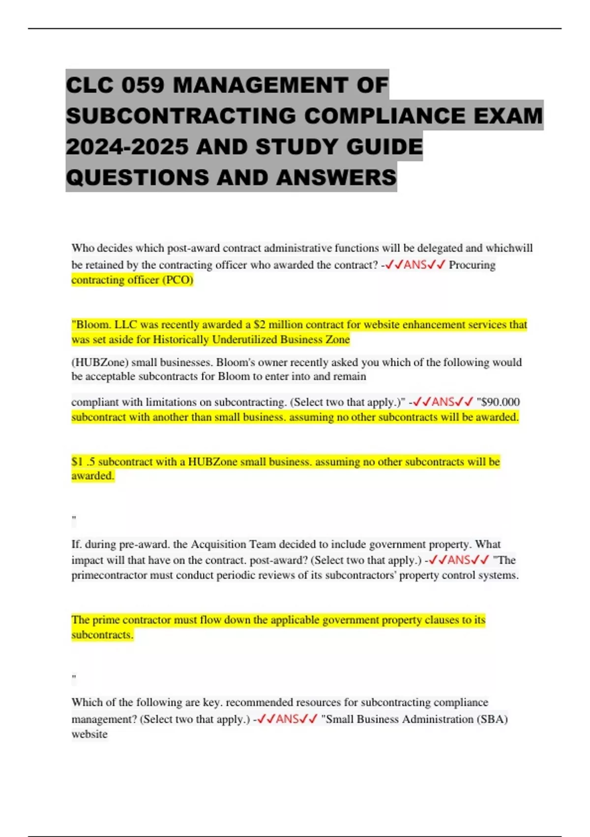 CLC 059 MANAGEMENT OF SUBCONTRACTING COMPLIANCE EXAM AND STUDY GUIDE QUESTIONS AND ANSWERS