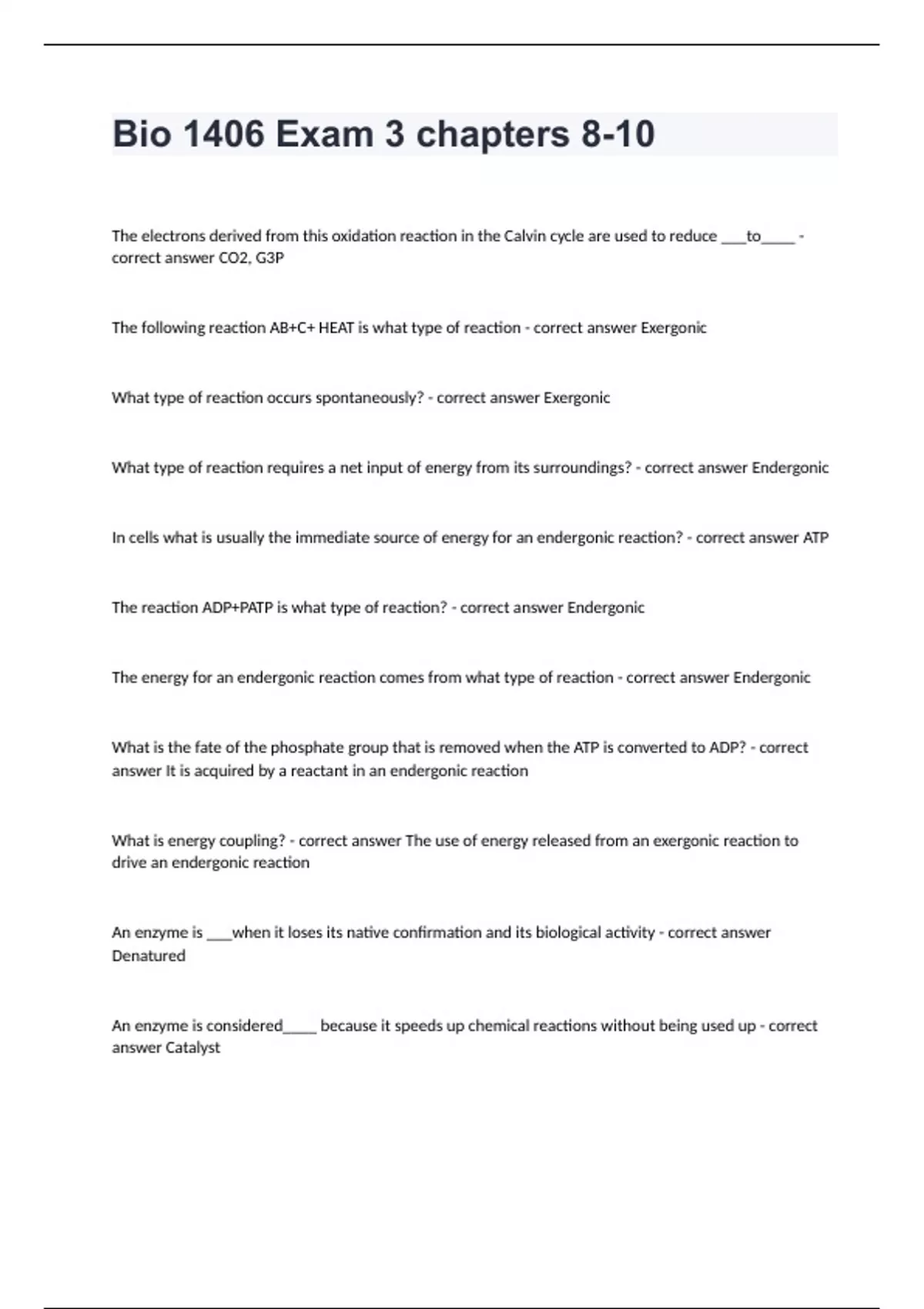 The electrons derived from this oxidation reaction in the Calvin cycle are used to reduce ___to____ - correct answer CO2, G3P The following reaction AB+C+ HEAT is what type of reaction - correct answer Exergonic What type of reaction occurs spontaneously? - correct answer Exergonic What type of reaction requires a net input of energy from its surroundings? - correct answer Endergonic In cells what is usually the immediate source of energy for an endergonic reaction? - correct answer ATP The reaction ADP+PATP is what type of reaction? - correct answer Endergonic The energy for an endergonic reaction comes from what type of reaction - correct answer Endergonic What is the fate of the phosphate group that is removed when the ATP is converted to ADP? - correct answer It is acquired by a reactant in an endergonic reaction What is energy coupling? - correct answer The use of energy released from an exergonic reaction to drive an endergonic reaction An enzyme is ___when it loses its native confirmation and its biological activity - correct answer Denatured An enzyme is considered____ because it speeds up chemical reactions without being used up - correct answer Catalyst