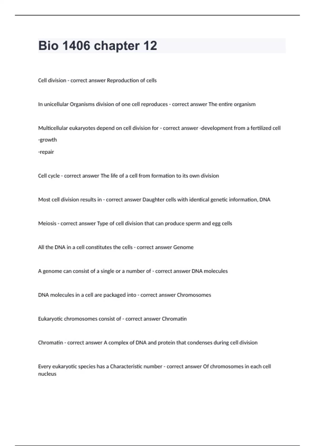 Bio 1406 chapter 12Cell division - correct answer Reproduction of cells In unicellular Organisms division of one cell reproduces - correct answer The entire organism Multicellular eukaryotes depend on cell division for - correct answer -development from a fertilized cell -growth -repair Cell cycle - correct answer The life of a cell from formation to its own division Most cell division results in - correct answer Daughter cells with identical genetic information, DNA Meiosis - correct answer Type of cell division that can produce sperm and egg cells All the DNA in a cell constitutes the cells - correct answer Genome A genome can consist of a single or a number of - correct answer DNA molecules DNA molecules in a cell are packaged into - correct answer Chromosomes Eukaryotic chromosomes consist of - correct answer Chromatin Chromatin - correct answer A complex of DNA and protein that condenses during cell division Every eukaryotic species has a Characteristic number - correct answer Of chromosomes in each cell nucleus