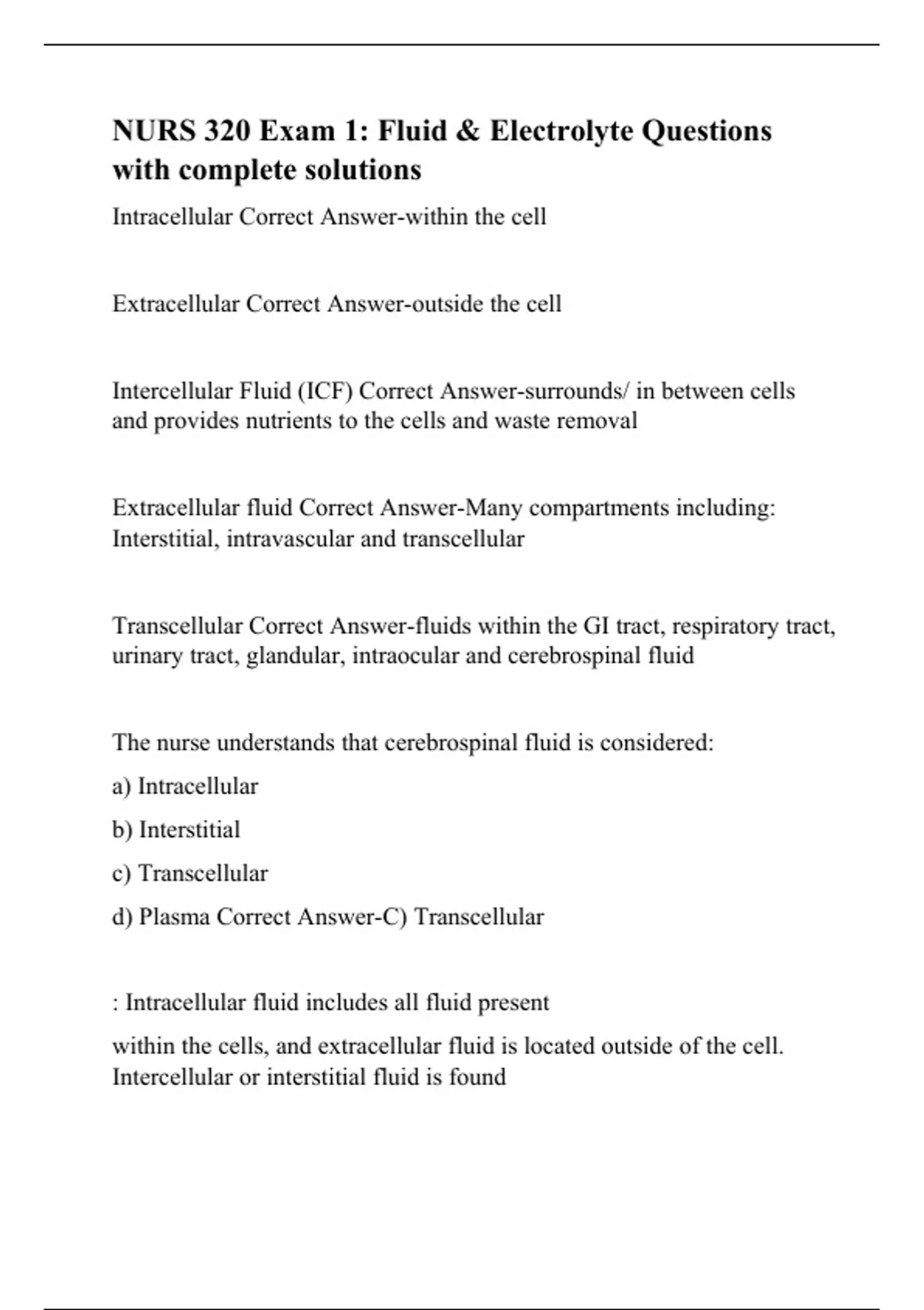 Intracellular Correct Answer-within the cell Extracellular Correct Answer-outside the cell Intercellular Fluid (ICF) Correct Answer-surrounds/ in between cells and provides nutrients to the cells and waste removal Extracellular fluid Correct Answer-Many compartments including: Interstitial, intravascular and transcellular Transcellular Correct Answer-fluids within the GI tract, respiratory tract, urinary tract, glandular, intraocular and cerebrospinal fluid The nurse understands that cerebrospinal fluid is considered: a) Intracellular b) Interstitial c) Transcellular d) Plasma Correct Answer-C) Transcellular : Intracellular fluid includes all fluid present within the cells, and extracellular fluid is located outside of the cell. Intercellular or interstitial fluid is f