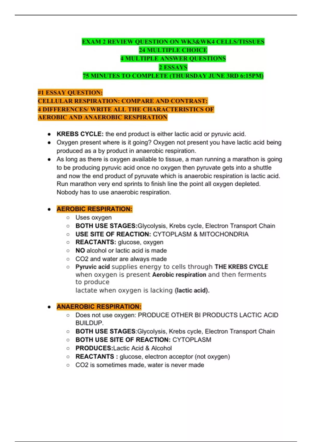 EXAM 2 REVIEW QUESTION ON WK3&WK4 CELLS/TISSUES 24 MULTIPLE CHOICE 4 MULTIPLE ANSWER QUESTIONS 2 ESSAYS 75 MINUTES TO COMPLETE (THURSDAY JUNE 3RD 6:15PM) #1 ESSAY QUESTION: CELLULAR RESPIRATION: COMPARE AND CONTRAST: 4 DIFFERENCES/ WRITE ALL THE CHARACTERISTICS OF AEROBIC AND ANAEROBIC RESPIRATION ● KREBS CYCLE: the end product is either lactic acid or pyruvic acid. ● Oxygen present where is it going? Oxygen not present you have lactic acid being produced as a by product in anaerobic respiration. ● As long as there is oxygen available to tissue, a man running a marathon is going to be producing pyruvic acid once no oxygen then pyruvate gets into a shuttle and now the end product of pyruvate which is anaerobic respiration is lactic acid. Run marathon very end sprints to finish line the point all oxygen depleted. Nobody has to use anaerobic respiration. ● AEROBIC RESPIRATION: ○ Uses oxygen ○ BOTH USE STAGES:Glycolysis, Krebs cycle, Electron Transport Chain ○ USE SITE OF REACTION: CYTOPLASM & MITOCHONDRIA ○ REACTANTS: glucose, oxygen ○ NO alcohol or lactic acid is made ○ CO2 and water are always made ○ Pyruvic acid supplies energy to cells through THE KREBS CYCLE when oxygen is present Aerobic respiration and then ferments to produce lactate when oxygen is lacking (lactic acid). ● ANAEROBIC RESPIRATION: ○ Does not use oxygen: PRODUCE OTHER BI PRODUCTS LACTIC ACID BUILDUP. ○ BOTH USE STAGES:Glycolysis, Krebs cycle, Electron Transport Chain ○ BOTH USE SITE OF REACTION: CYTOPLASM ○ PRODUCES:Lactic Acid & Alcohol ○ REACTANTS : glucose, electron acceptor (not oxygen) ○ CO2 is sometimes made, water is never made #2 ESSAY QUESTION:COMPARE AND CONTRAST MITOSIS AND MEIOSIS ● MITOSIS: (FIG.4.14 PG.140) ○ One cell division ○ Daughter cells identical ○ Associated with growth and asexual reproduction ○ Starts out with diploid cells ends with 2 daughter cells after on division ○ 46 chromosomes in each daughter cell ○ # of chromosomes stay the same ○ Produced in somatic cells ■ PMAT: PHASES OF MITOSIS ● PROPHASE: Chromosomes become visible, spindle fibers form, and nuclear envelope breaks up.( Nuclear condensation) ● METAPHASE:Chromatids line up in the middle of the cell & spindle fibers pull them. ● ANAPHASE:Chromatids separate and move to the poles; spindle fibers pull them. ● TELOPHASE:Chromosomes disappear and the nucleus envelope forms daughter cells. ● CYTOKINESIS: the division of the cytoplasm into two cells. ● INTERPHASE: in this phase waiting for the next cell cycle. ● MEIOSIS: ○ Don't make identical copies ○ Produces gametes ○ Sexual reproduction ○ Egg and sperm cells are Haploid cells then 4 daughter cells produced after one division. (one division produces 4 daughter cells) ○ 23 chromosomes in each daughter cell ○ # chromosomes splits in half ○ MEIOSIS PROCESS: process in cell division where # of chromosomes decreases to half the original # occurs by 2 divisions of the nucleus and results in the production of 4 sex cells (gametes) ● BOTH MITOSIS/MEIOSIS: ○ Forms of cellular reproduction ○ Involve chromosomes from both parents(duplication of chromosomes) CONNECTIVE TISSUE: IDENTIFY THEM TABLE 5.4 PG.165 TABLE 5.5 PG. 167 ● ADIPOSE TISSUE: FAT TISSUES: Adipocytes=FAT ○ LOCATED: in subcutaneous layer: under skin above muscle ○ FUNCTION: Energy storage, thermal insulation, heat production, protective cushion,for some organs, shapes the body. ○ Breaking down fats for when we need it ○ FAT CELLS UNDER MICROSCOPE LOOK LIKE “DIAMOND RING” ■ Nucleus pushed against plasma membrane blood vessels present. ○ FAT CELLS PRODUCE ESTROGEN HORMONE ■ EX amenorrhea-loss of menstrual cycle b/c of low body fat. ■ Does Not convert estrogen to an active form. ● Areolar Tissue: loose connective (HOLDS INTESTINAL FLUIDS/TRANSPORT NUTRIENTS & WASTE) ○ CONTAINS ALL 3 FIBERS AND SECRETES FIBROBLASTS. ● Reticular Tissue: mesh tissue: (lymphatic organs)(ex. Lymph nodes, spleen) ● Dense Regular: tightly bound (runs parallel in picture) ● Dense Irregular: randomly arranged (Stratum Basale) ● 3 TYPES PROTEIN FIBERS FOUND IN CONNECTIVE TISSUES ○ ELASTIC FIBERS: STRETCH AND RECOIL AND CONTAIN THE PROTEIN CALLED ELASTIN. ○ RETICULAR FIBERS: FOUND IN ORGANS THAT HAVE A LOT OF MESH LIKE INTERNAL STRUCTURES (EX SPLEEN FULL OF THESE B/C IT ACTS LIKE A FILTER) ○ COLLAGENOUS FIBERS:VERY STRONG AND THIN STRONGEST OF THE 3 FIBERS. BONE: Calcified matrix arranged in concentric lamellae around the central canal.(PG170 TABLE 5.7) INCLUDE: Lacunae, Concentric lamellae of osteon, Central canal, Osteon LOCATIONS: Skeletal BONE CELL: Osteocytes FUNCTIONS: Provide strength, structure, protection for organs,make red blood cells, store calcium and phosphorus. TENDONS: connective tissue that connects muscles to bone. LIGAMENTS: tissue connects bone to bone. ■ Joints: place where 2 bones meet only part of the body that moves. ● Examples: wrist, shoulder BLOOD: Erythrocytes appear as pale pink discs w/ light centers and no nuclei,Leukocytes slightly larger, have shaped nuclei, stained violet.