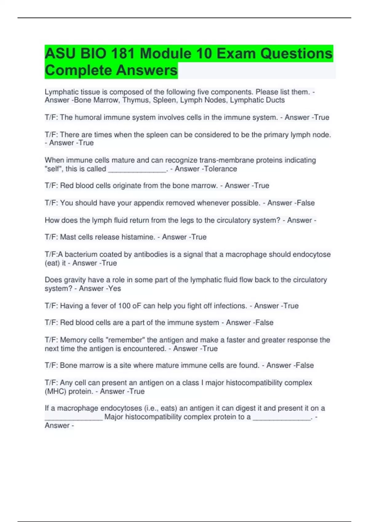 ASU BIO 181 Module 10 Exam Questions Complete Answers Lymphatic tissue is composed of the following five components. Please list them. - Answer -Bone Marrow, Thymus, Spleen, Lymph Nodes, Lymphatic Ducts T/F: The humoral immune system involves cells in the immune system. - Answer -True T/F: There are times when the spleen can be considered to be the primary lymph node. - Answer -True When immune cells mature and can recognize trans-membrane proteins indicating "self", this is called ______________. - Answer -Tolerance T/F: Red blood cells originate from the bone marrow. - Answer -True