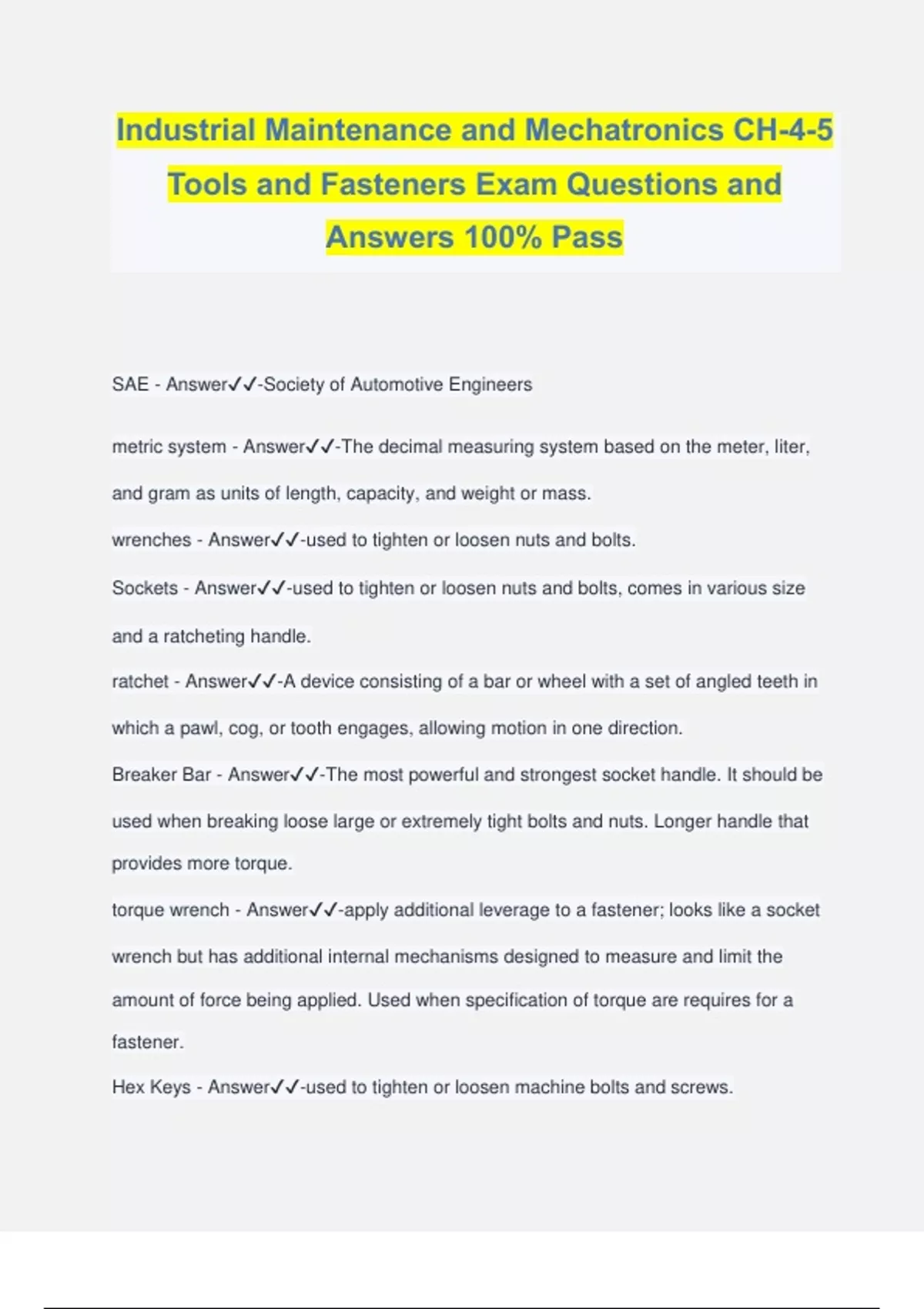Industrial Maintenance and Mechatronics CH-4-5 Tools and Fasteners Exam Questions and Answers 100% Pass SAE - Answer️️ -Society of Automotive Engineers metric system - Answer️️ -The decimal measuring system based on the meter, liter, and gram as units of length, capacity, and weight or mass. wrenches - Answer️️ -used to tighten or loosen nuts and bolts. Sockets - Answer️️ -used to tighten or loosen nuts and bolts, comes in various size and a ratcheting handle. ratchet - Answer️️ -A device consisting of a bar or wheel with a set of angled teeth in which a pawl, cog, or tooth engages, allowing motion in one direction. Breaker Bar - Answer️️ -The most powerful and strongest socket handle. It should be used when breaking loose large or extremely tight bolts and nuts. Longer handle t
