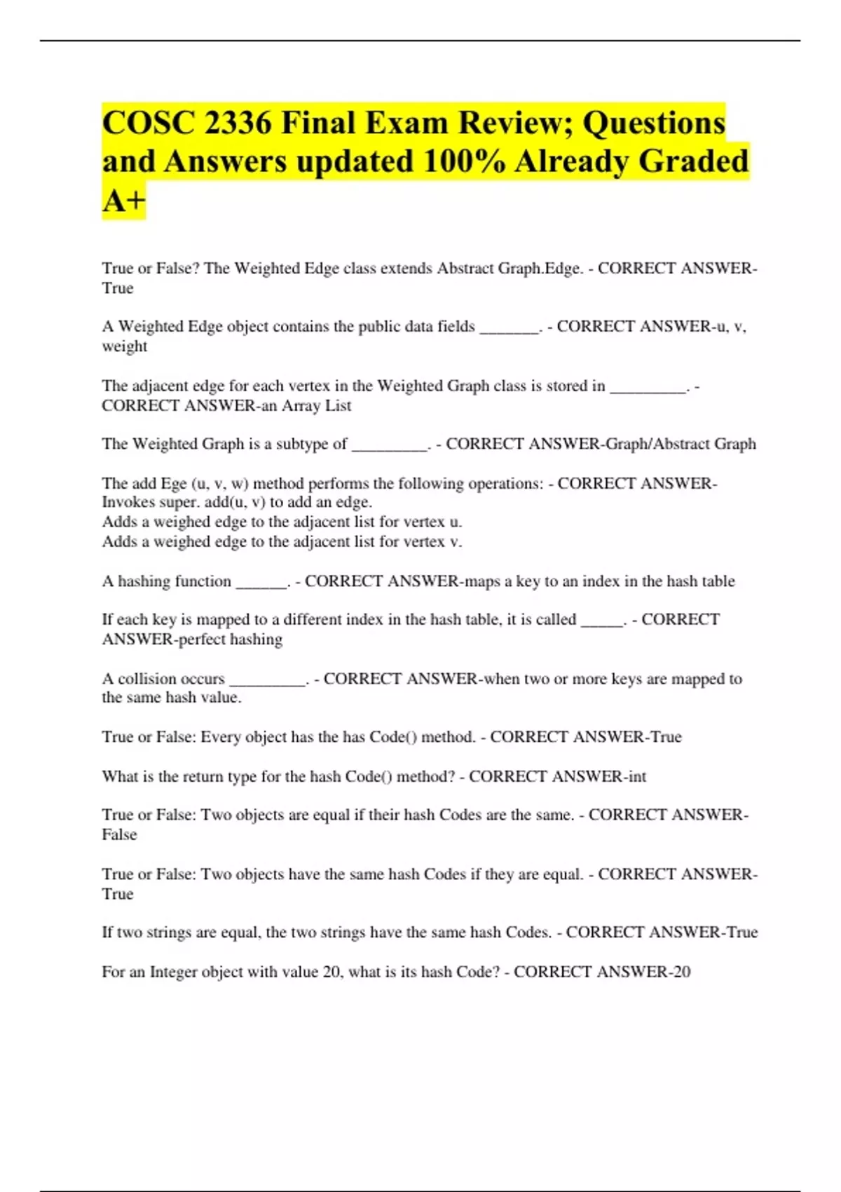COSC 2336 Final Exam Review; Questions and Answers updated 100% Already Graded A+ True or False? The Weighted Edge class extends Abstract Graph.Edge. - CORRECT ANSWER-True A Weighted Edge object contains the public data fields _______. - CORRECT ANSWER-u, v, weight The adjacent edge for each vertex in the Weighted Graph class is stored in _________. - CORRECT ANSWER-an Array List The Weighted Graph is a subtype of _________. - CORRECT ANSWER-Graph/Abstract Graph The add Ege (u, v, w) method performs the following operations: - CORRECT ANSWER-Invokes super. add(u, v) to add an edge. Adds a weighed edge to the adjacent list for vertex u. Adds a weighed edge to the adjacent list for vertex v. A hashing function ______. - CORRECT ANSWER-maps a key to an index in the hash table If each key is mapped to a different index in the hash table, it is called _____. - CORRECT ANSWER-perfect hashing A collision occurs _________. - CORRECT ANSWER-when two or more keys are mapped to the same hash value. True or False: Every object has the has Code() method. - CORRECT ANSWER-True What is the return type for the hash Code() method? - CORRECT ANSWER-int True or False: Two objects are equal if their hash Codes are the same. - CORRECT ANSWER-False True or False: Two objects have the same hash Codes if they are equal. - CORRECT ANSWER-True If two strings are equal, the two strings have the same hash Codes. - CORRECT ANSWER-True For an Integer object with value 20, what is its hash Code? - CORRECT ANSWER-20 1<<2 is ______. - CORRECT ANSWER-4 _______ is to find an open location in the hash table in the event of collision. - CORRECT ANSWER-Open addressing When a collision occurs during the insertion of an entry to a hash table, _________ finds the next available location sequentially. - CORRECT ANSWER-linear probing The ______ places all entries with the same hash index into the same location, rather than finding new locations. - CORRECT ANSWER-separate chaining scheme _______ measures how full the hash table is. - CORRECT ANSWER-Load factor _______ finds the next available location quadratically when a collision occurs. - CORRECT ANSWER-Quadratic probing _____ maps a key to an index in a Hash table. - CORRECT ANSWER-Hash Function _____ is to reinsert the elements into the table after the hash table is resized. - CORRECT ANSWER-Rehash _____ is the ration between the number of elements and the ash table size. - CORRECT ANSWER-Load Factor _____ occurs when two keys are mapped to the same index. - CORRECT ANSWER-Collision _____ uses a secondary hashing function along with the primary hash function to find an available location for a key when a collision occurs - CORRECT ANSWER-Double Hashing A ____ is an edge that links to a vertex to itself. - CORRECT ANSWER-loop If two vertices are connected by two or more edges, these edges are called - CORRECT ANSWER-parallel edge A ____ is the one in which every two pairs of vertices are connected - CORRECT ANSWER-complete graph What is the number of edges in a complete graph of n vertices? - CORRECT ANSWER-n(n-1)/2 What is the number of edges in a tree of n vertices? - CORRECT ANSWER-n - 1 ___ is graph in which edges are not weighted - CORRECT ANSWER- Unweighted Graph ____ is an edge that connects to a vertex itself. - CORRECT ANSWER-Loop _____ of G is a sub-graph of G. The sub-graph connects all the vertices in G without cycles. - CORRECT ANSWER-Spanning Tree ____ refers to two or more edges between two vertices. - CORRECT ANSWER-Parallel Edges _____ is a graph that does not have loops or parallel edges. - CORRECT ANSWER-Simple Graph _____ is a graph in which edges have no directions - CORRECT ANSWER-Undirected Graph ____ of a vertex is the number of edges connected to the vertex. - CORRECT ANSWER-Degree ___ refers to a closed path in a graph. - CORRECT ANSWER-Cycle ____ of G is a graph whose vertices is a subset of the vertices in G and edges are subset of edges in G. - CORRECT ANSWER-Sub-graph ____ is a graph in which there is an edge between any pair of vertices. - CORRECT ANSWER-Complete Graph The _____ search of a graph first visits a vertex, then it recursively visits all the vertices adjacent to that vertex. - CORRECT ANSWER-depth-first True of False: The time complexity of the DFS algorithm is O(|E|+|V|). - CORRECT ANSWER-True The ____ search of a graph first visits a vertex, then all its adjacent vertices, then all the vertices adjacent to those vertices and so on. - CORRECT ANSWER-breadth-first True or False: The time complexity of the BFS algorithm is O(|E|+|V|), - CORRECT ANSWER-True True or false: The WeightedEdge class extends AbstractGraph Edge - CORRECT ANSWER-True A WeightedEdge object contains the public data fields ______. - CORRECT ANSWER-u,v,weight The adjacent edge for each vertex in the WeightedGraph class is stored in____ - CORRECT ANSWER-an ArrayList The WeightedGraph is a subtype of ____. - CORRECT ANSWER-Abstract Graph and Graph The addEdge(u,v,w) method performs the following operations: - CORRECT ANSWER-Invokes (u,v) to add an edge. Adds a weighted edge to the adjacent list ofr vertex u.