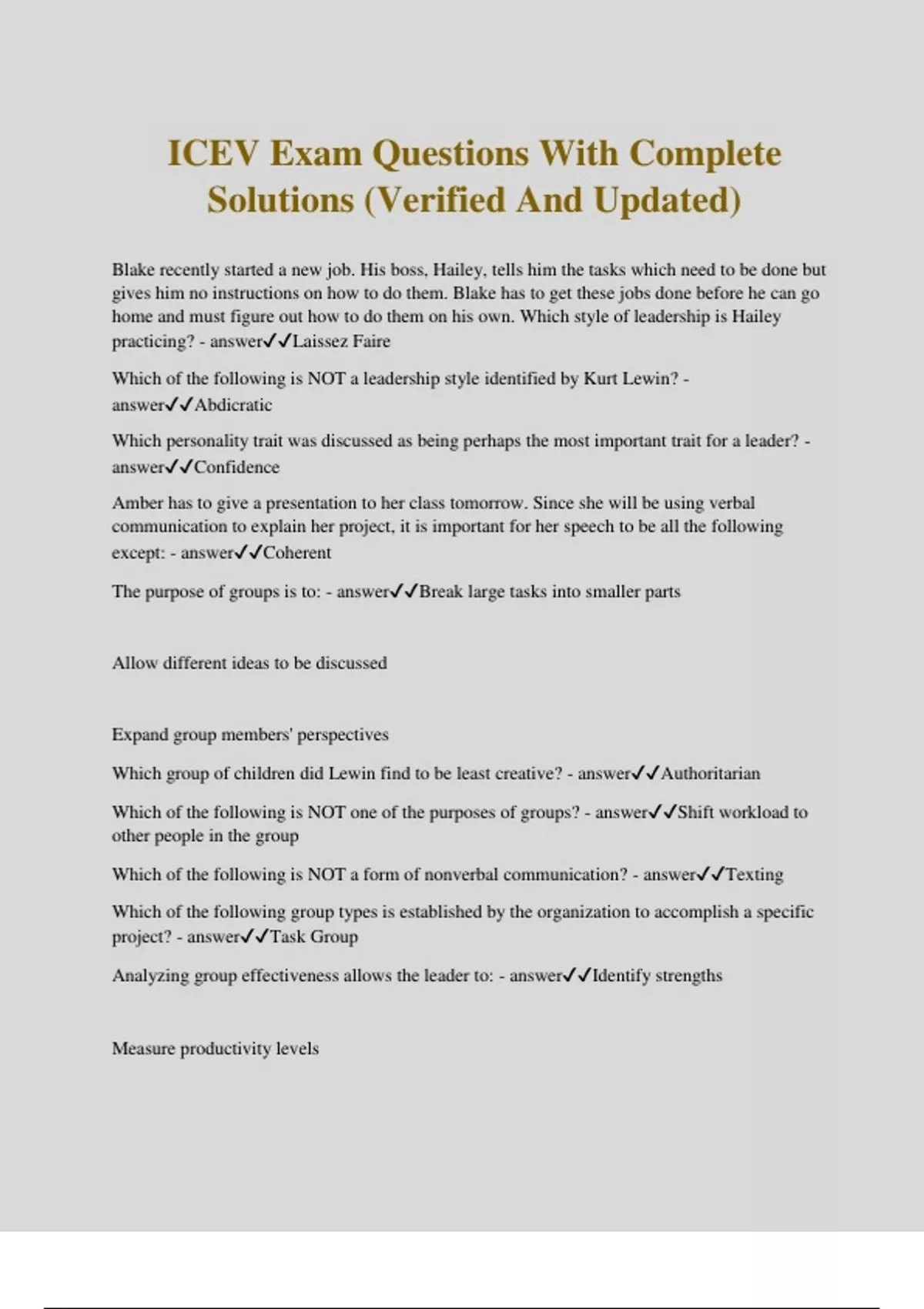 ICEV Exam Questions With Complete Solutions (Verified And Updated) Blake recently started a new job. His boss, Hailey, tells him the tasks which need to be done but gives him no instructions on how to do them. Blake has to get these jobs done before he can go home and must figure out how to do them on his own. Which style of leadership is Hailey practicing? - answerLaissez Faire Which of the following is NOT a leadership style identified by Kurt Lewin? - answerAbdicratic Which personality trait was discussed as being perhaps the most important trait for a leader? - answerConfidence Amber has to give a presentation to her class tomorrow. Since she will be using verbal communication to explain her project, it is important for her speech to be all the following except: - answerCoherent The purpose of groups is to: - answerBreak large tasks into smaller parts Allow different ideas to be discussed Expand group members' perspectives Which group of children did Lewin find to be least creative? - answerAuthoritarian Which of the following is NOT one of the purposes of groups? - answerShift workload to other people in the group Which of the following is NOT a form of nonverbal communication? - answerTexting Which of the following group types is established by the organization to accomplish a specific project? - answerTask Group Analyzing group effectiveness allows the leader to: - answerIdentify strengths Measure productivity levels Compare the results to the vision Which of the following is NOT true of teamwork in the workplace? - answerCreates an inefficient environment Who demonstrated a charismatic, transformational leadership? - answerMartin Luther King Jr. Which of the following is NOT a successful tactic to use when managing a team? - answerBeing Late Which of the following is NOT a quality of collaboration? - answerInconsistency When a team member rejects the ideas of others, they are displaying which team role? - answerBlocker Which is NOT true of great leaders? - answerExhibiting one leadership style Which of the following terms allows individuals to use their understanding of others to choose how they think and act? - answerEmotional Intelligence Which of the following is considered the action of leading a group of people? - answerLeadership Individuals who are action-oriented and more concerned with results than people are considered which personality type? - answerDriver Which of the following terms describes the natural abilities individuals are born with? - answerTalents Julie, the manager of a restaurant, was frustrated because one of the waiters was absent twice without any notification. However, instead of saying, "You are unreliable," Julie asked, "Could you give me a little advanced notice when you won't be able to work?" Which of the following positive language skills describes Julie's communication style? - answerUsing a specific behavioral statement David, the manager of a bookstore, prefers to directly point out other's mistakes. Some employees see his communication style as rude and aggressive. Which of the following can cause such a conflict? - answerdifferences in work styles Which of the following conflicts can be categorized as a group conflict? - answerConflict between a company's sales and marketing departments Which of the following third parties should be involved when the conflicting parties believe they can reach a solution, but need a third party to manage the process? - answerA facilitator According to Dr. Sandra Collins, what are the three major types of factors which cause conflicts? - answerRelationship factors, personal factors, situational factors