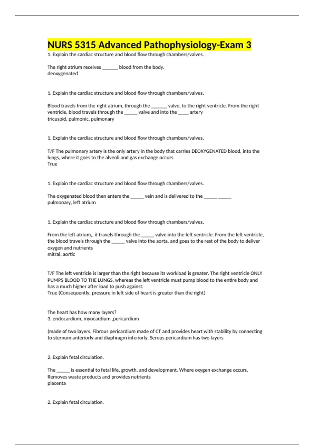NURS 5315 Advanced Pathophysiology-Exam 3 1. Explain the cardiac structure and blood flow through chambers/valves. The right atrium receives ______ blood from the body. deoxygenated 1. Explain the cardiac structure and blood flow through chambers/valves. Blood travels from the right atrium, through the ______ valve, to the right ventricle. From the right ventricle, blood travels through the _____ valve and into the ____ artery tricuspid, pulmonic, pulmonary 1. Explain the cardiac structure and blood flow through chambers/valves. T/F The pulmonary artery is the only artery in the body that carries DEOXYGENATED blood, into the lungs, where it goes to the alveoli and gas exchange occurs True 1. Explain the cardiac structure and blood flow through chambers/valves. The oxygenated blood then enters the _____ vein and is delivered to the _____ _____ pulmonary, left atrium 1. Explain the cardiac structure and blood flow through chambers/valves. From the left atrium,. it travels through the _____ valve into the left ventricle. From the left ventricle, the blood travels through the _____ valve into the aorta, and goes to the rest of the body to deliver oxygen and nutrients mitral, aortic T/F The left ventricle is larger than the right because its workload is greater. The right ventricle ONLY PUMPS BLOOD TO THE LUNGS, whereas the left ventricle must pump blood to the entire body and has a much higher after load to push against. True (Consequently, pressure in left side of heart is greater than the right) The heart has how many layers? 3. endocardium, myocardium ,pericardium (made of two layers. Fibrous pericardium made of CT and provides heart with stability by connecting to sternum anteriorly and diaphragm inferiorly. Serous pericardium has two layers 2. Explain fetal circulation. The _____ is essential to fetal life, growth, and development. Where oxygen exchange occurs. Removes waste products and provides nutrients placenta 2. Explain fetal circulation. T/F During fetal growth and development, manner in which blood flows is different than it is at birth. Blood shunted around some areas and mixes in other areas. Different channels which are OPEN to allow for blood flow, and after birth, channels close and./or develop into various ligaments. True 2. Explain fetal circulation. The umbilical vein receives _______ blood from the placenta. The umbilical vein connects to the ______ circulation but also connects to the inferior vena cava by the _____ _____ oxygenated, hepatic, ductus venosus 2. Explain fetal circulation. The ____ ____ allows the oxygen rich blood to enter the inferior vena cava and some blood does enter the hepatic circulation. From the inferior vena cava, the blood is emptied into the ____ ____ ductus venosus, right atrium