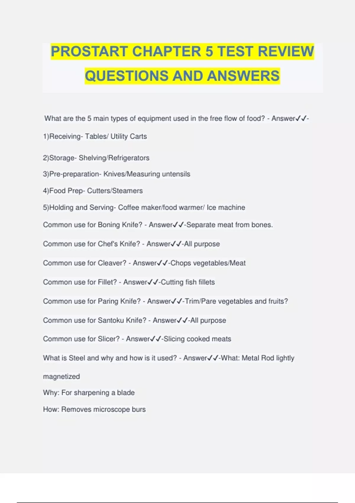 PROSTART CHAPTER 5 TEST REVIEW QUESTIONS AND ANSWERS What are the 5 main types of equipment used in the free flow of food? - Answer️️ - 1)Receiving- Tables/ Utility Carts 2)Storage- Shelving/Refrigerators 3)Pre-preparation- Knives/Measuring untensils 4)Food Prep- Cutters/Steamers 5)Holding and Serving- Coffee maker/food warmer/ Ice machine Common use for Boning Knife? - Answer️️ -Separate meat from bones. Common use for Chef's Knife? - Answer️️ -All purpose Common use for Cleaver? - Answer️️ -Chops vegetables/Meat Common use for Fillet? - Answer️️ -Cutting fish fillets Common use for Paring Knife? - Answer️️ -Trim/Pare vegetables and fruits? Common use for Santoku Knife? - Answer️️ -All purpose Common use for Slicer? - Answer️️ -Slicing cooked meats What is Steel and why and how is it used? - Answer️️ -What: Metal Rod lightly magnetized Why: For sharpening a blade How: Removes microscope burs What is the difference between a China cap/ Chinois / Colander / Strainer / Sieve? - Answer️️ -China Cap: used to remove all solid ingredients Chinois: used for very small solid ingredients Colander: Drains liquid from pasta and vegetables Sieve: mesh screen to sift flavor/ dry baking ingredients What is the difference between Offset spatula / Sandwich spreader / Rubber spatula / Straight spatula? - Answer️️ -Offset spatula: Turns foods on a griddle or broiler Sandwich spreader: used to spread sandwich fillings Rubber spatula: Fold ingredients together/ scrape sides of a bowl Straight spatula:Used for icing/ glazing Whats the difference between pots and pans? - Answer️️ -Pans are usually smaller and shallower than pots How would you care for the following metal: (Aluminum, Cast iron, Chrome, Copper, Stainless steel, Nonstick coating) - Answer️️ -Aluminum: Hand wash in soap water Cast Iron: wash in warm, sudsy water Chrome: wash in warm water with soap Copper: Use commercial cleaners Stainless steel: wash in hot soapy water Nonstick coating: use plastic mesh scrubber What is an immersion blender? - Answer️️ -A hand mixer What is a mandolin? - Answer️️ -Manually operated slicer