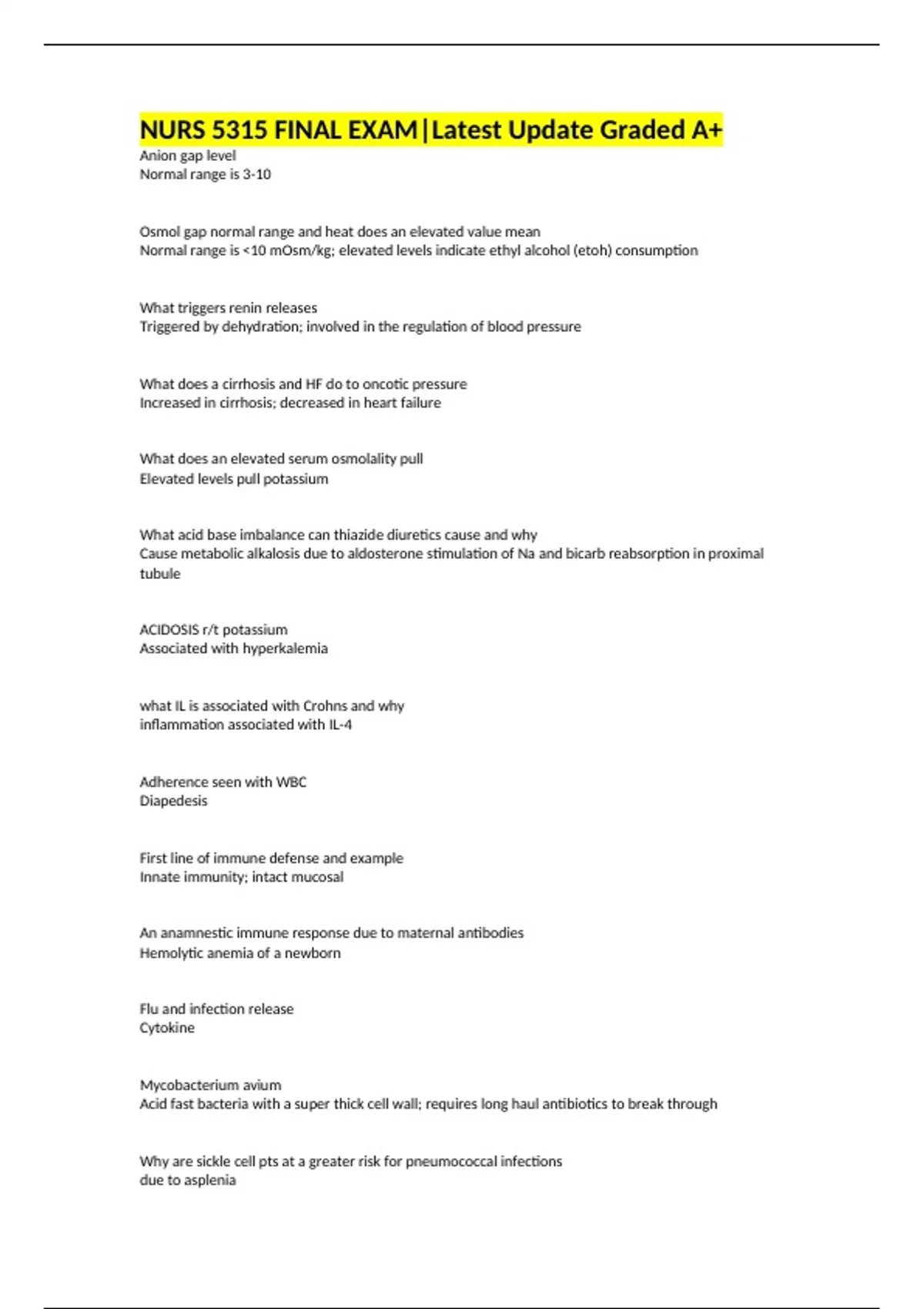 NURS 5315 FINAL EXAM|Latest Update Graded A+ Anion gap level Normal range is 3-10 Osmol gap normal range and heat does an elevated value mean Normal range is 10 mOsm/kg; elevated levels indicate ethyl alcohol (etoh) consumption What triggers renin releases Triggered by dehydration; involved in the regulation of blood pressure What does a cirrhosis and HF do to oncotic pressure Increased in cirrhosis; decreased in heart failure What does an elevated serum osmolality pull Elevated levels pull potassium What acid base imbalance can thiazide diuretics cause and why Cause metabolic alkalosis due to aldosterone stimulation of Na and bicarb reabsorption in proximal tubule ACIDOSIS r/t potassium Associated with hyperkalemia
