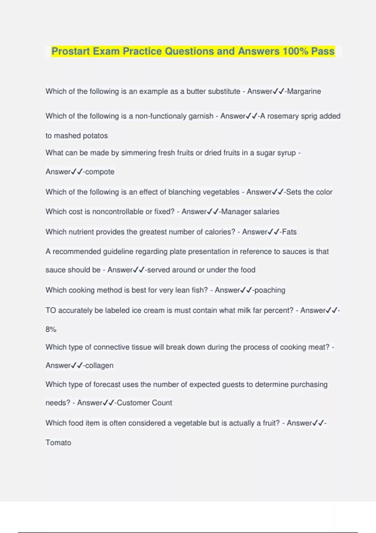 Prostart Exam Practice Questions and Answers 100% Pass Which of the following is an example as a butter substitute - Answer️️ -Margarine Which of the following is a non-functionaly garnish - Answer️️ -A rosemary sprig added to mashed potatos What can be made by simmering fresh fruits or dried fruits in a sugar syrup - Answer️️ -compote Which of the following is an effect of blanching vegetables - Answer️️ -Sets the color Which cost is noncontrollable or fixed? - Answer️️ -Manager salaries Which nutrient provides the greatest number of calories? - Answer️️ -Fats A recommended guideline regarding plate presentation in reference to sauces is that sauce should be - Answer️️ -served around or under the food Which cooking method is best for very lean fish? - Answer️️ -poaching TO accurately be labeled ice cream is must contain what milk far percent? - Answer️️ - 8% Which type of connective tissue will break down during the process of cooking meat? - Answer️️ -collagen Which type of forecast uses the number of expected guests to determine purchasing needs? - Answer️️ -Customer Count Which food item is often considered a vegetable but is actually a fruit? - Answer️️ - Tomato Which potato is the standard baking potato - Answer️️ -Russet Emailing information to college students about the coffee shop on campus is an example of - Answer️️ -direct marketing which is the best method for preserving the nutrients in green vegetables during cooking? - Answer️️ -Steaming or stir-frying Lean doughs contain very little or no - Answer️️ -sugar and fat what is the defining factor in heavy cream? - Answer️️ -fat What is the required internal temperature that poultry stuffin