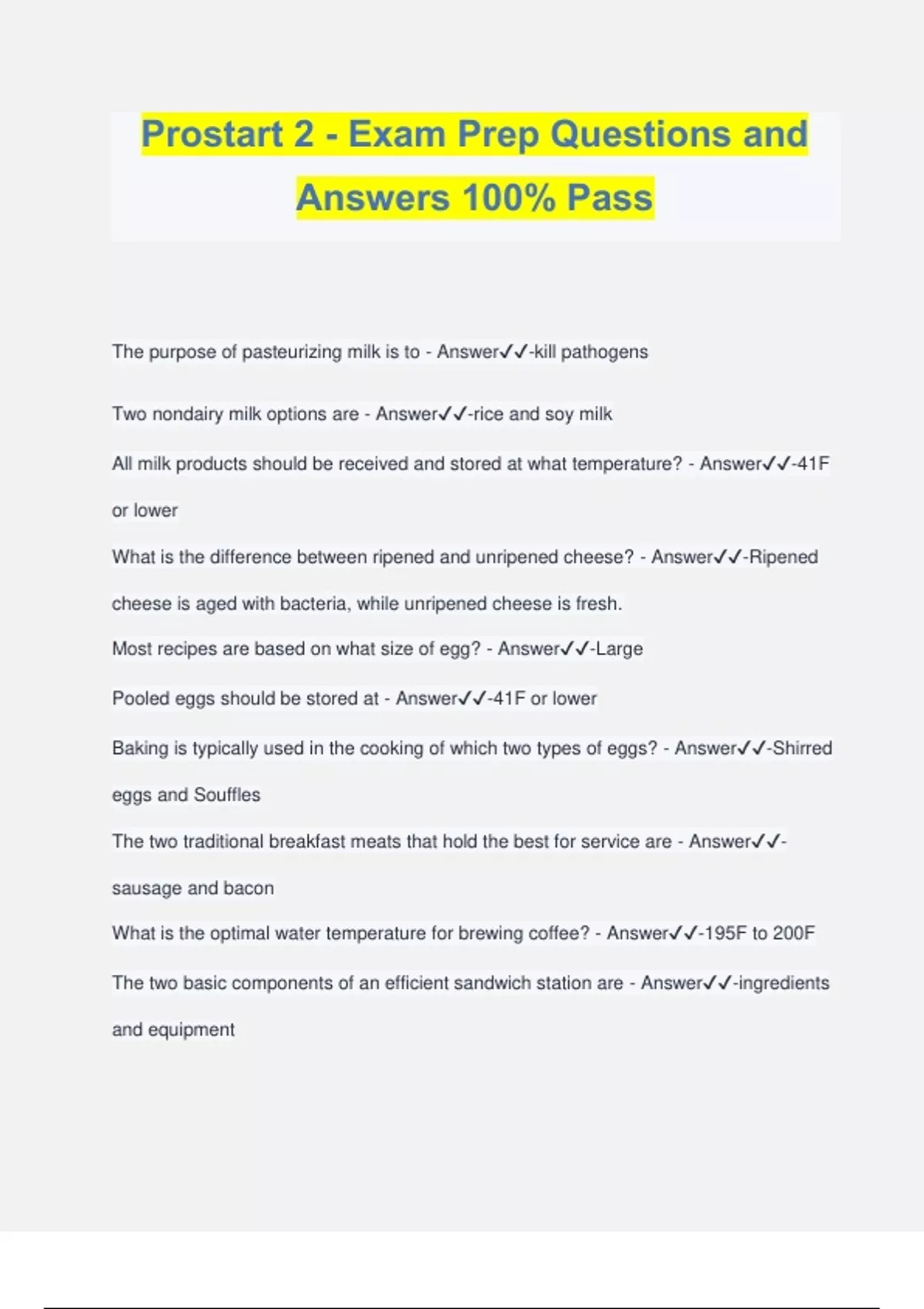 Prostart 2 - Exam Prep Questions and Answers 100% Pass The purpose of pasteurizing milk is to - Answer️️ -kill pathogens Two nondairy milk options are - Answer️️ -rice and soy milk All milk products should be received and stored at what temperature? - Answer️️ -41F or lower What is the difference between ripened and unripened cheese? - Answer️️ -Ripened cheese is aged with bacteria, while unripened cheese is fresh. Most recipes are based on what size of egg? - Answer️️ -Large Pooled eggs should be stored at - Answer️️ -41F or lower Baking is typically used in the cooking of which two types of eggs? - Answer️️ -Shirred eggs and Souffles The two traditional breakfast meats that hold the best for service are - Answer️️ - sausage and bacon What is the optimal water temperature for brewing coffee? - Answer️️ -195F to 200F The two basic components of an efficient sandwich station are - Answer️️ -ingredients and equipment
