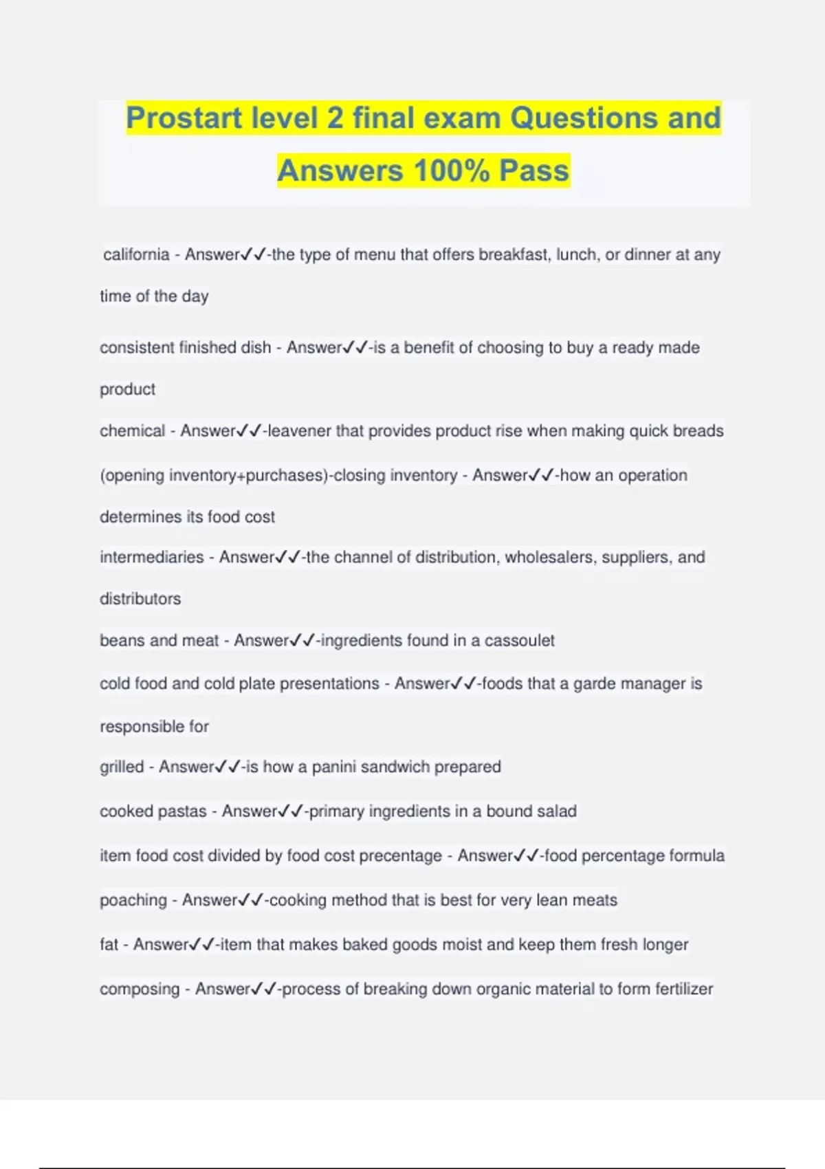 Prostart level 2 final exam Questions and Answers 100% Pass california - Answer️️ -the type of menu that offers breakfast, lunch, or dinner at any time of the day consistent finished dish - Answer️️ -is a benefit of choosing to buy a ready made product chemical - Answer️️ -leavener that provides product rise when making quick breads (opening inventory+purchases)-closing inventory - Answer️️ -how an operation determines its food cost intermediaries - Answer️️ -the channel of distribution, wholesalers, suppliers, and distributors beans and meat - Answer️️ -ingredients found in a cassoulet cold food and cold plate presentations - Answer️️ -foods that a garde manager is responsible for grilled - Answer️️ -is how a panini sandwich prepared cooked pastas - Answer️️ -primary ingredients in a bound salad item food cost divided by food cost precentage - Answer️️ -food percentage formula poaching - Answer️️ -cooking method that is best for very lean meats fat - Answer️️ -item that makes baked goods moist and keep them fresh longer composing - Answer️️ -process of breaking down organic material to form fertilizer accompaniment - Answer️️ -a small amount of potato salad would be appropriate as which type of salad (desired yield divided by original yield) x each ingredient amount - Answer️️ - decreasing a recipe yield formula home fried - Answer️️ -the traditional form of cooking breakfast potatoes that are shredded or chopped raw allowances need to be made for waste, employee meals, and promotions - Answer️️ - why the cost of food NOT equal the cost of actual sold food base, body, garnish, and dressing - Answer️️ -four parts of a salad sales and costs - Answer️️ -compilation of profit and loss report skim, whole, condensed, half & half, heavy cream - Answer️️ -lowest to highest milk fat content start small and look for logical opportunities - Answer️️ -when an operation wants to buy food produced by local sources primary - Answer️️ -the distribution channel a farmer represents coffee grounds and paper napkins - Answer️️ -materials that are desirable for composting sales promotion - Answer️️ -offering 2for1 appetizers every Friday between 3-5pm is what market communciation a fat is rubbed or cut into flour until the mixture is mealy or