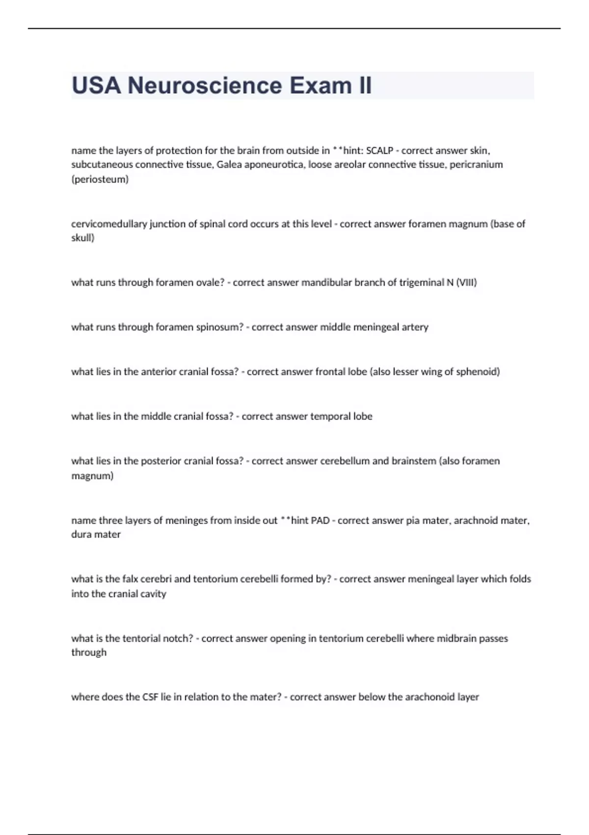usa neuroscience exam ii questions and answers cer