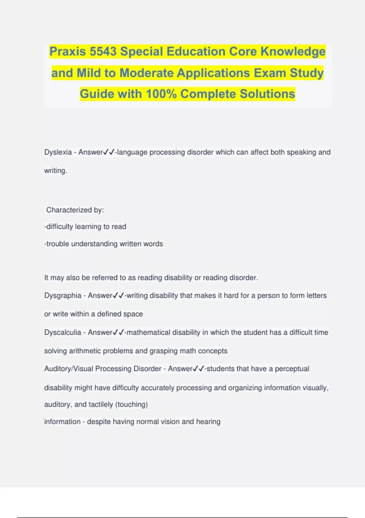 Praxis 5543 Special Education Core Knowledge and Mild to Moderate Applications Exam Study Guide with 100% Complete Solutions Dyslexia - Answer️️ -language processing disorder which can affect both speaking and writing. Characterized by: -difficulty learning to read -trouble understanding written words It may also be referred to as reading disability or reading disorder. Dysgraphia - Answer️️ -writing disability that makes it hard for a person to form letters or write within a defined space Dyscalculia - Answer️️ -mathematical disability in which the student has a difficult time solving arithmetic problems and grasping math concepts Auditory/Visual Processing Disorder - Answer️️ -students that have a perceptual disability might have difficulty accurately processing and organizing information visually, auditory, and tactilely (touching) information - despite having normal vision and hearing Speech or Language Impairment - Answer️️ -a communication disorder such as stuttering, impaired articulation, a language impairment, or a voice impairment that adversely affects a child's educational performance Traumatic Brain Injury - Answer️️ -an acquired injury to the brain caused by an external physical force (not congenital, degenerative or caused during birth), resulting in total or partial functional disability or psychosocial impairment, or both, that adversely affects a child's educational performance affects areas (>=1) cognition; language; memory; attention; reasoning; abstract thinking; judgment; problem-solving; sensory, perceptual, and motor abilities; psychosocial behavior; physical functions; information processing; and speech Section 504, Rehabilitation Act - Answer️️ -a person cannot be excluded on the basis of a handicap alone from any program or activity receiving federal funds -1973 -covers lifetime -uses 504 Plans -no funding for schools Curriculum Based Measurement (CBM) - Answer️️ -based upon curricular information, assesses student's response to intervention (formative or summative classroom assessment) IQ Achievement Discrepancy Model - Answer️️ -LD = discrepancy between IQ and actual performance Education for All Handicapped Children Act - Answer️️ -- 1975 - also: Public Law 94-142 (PL 94-142) - FAPE for all students with disabilities - LRE - Parental Dispute Procedures - rights of full citizenship and equal access - < = 21 years of age Normalization Principle - Answer️️ -all individuals with disabilities have the right to enjoy full inclusion into society economically, politically, socially, culturally, and educationally No Child Left Behind Act - Answer️️ -- 2001 - Accountability for federal aid - majority of students with disabilities must take standardized tests with sim
