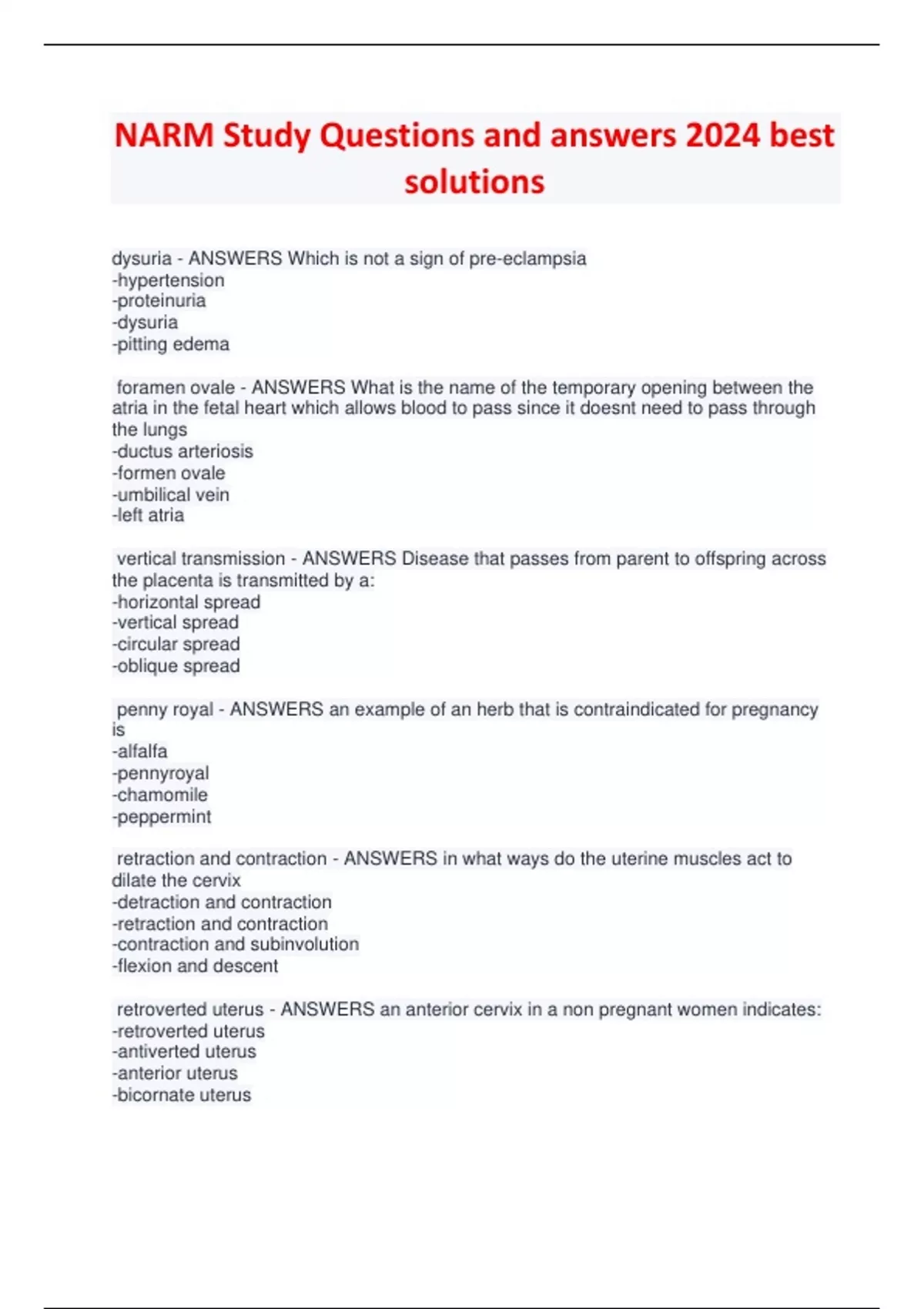 NARM Study Questions and answers 2024 best solutions dysuria - ANSWERS Which is not a sign of pre-eclampsia -hypertension -proteinuria -dysuria -pitting edema foramen ovale - ANSWERS What is the name of the temporary opening between the atria in the fetal heart which allows blood to pass since it doesnt need to pass through the lungs -ductus arteriosis -formen ovale -umbilical vein -left atria vertical transmission - ANSWERS Disease that passes from parent to offspring across the placenta is transmitted by a: -horizontal spread -vertical spread -circular spread -oblique spread penny royal - ANSWERS an example of an herb that is contraindicated for pregnancy is -alfalfa -pennyroyal -chamomile -peppermint retraction and contraction - ANSWERS in what ways do the uterine muscles act to dilate the cervix -detraction and contraction -retraction and contraction -contraction and subinvolution -flexion and descent retroverted uterus - ANSWERS an anterior cervix in a non pregnant women indicates: -retroverted uterus -antiverted uterus -anterior uterus -bicornate uterus estrogen - ANSWERS which hormone controls the proliferative phase of the menstrual cycle - progesterone -luteinizing hormone -hCG -Estrogen prolactin - ANSWERS this hormone does not play a part in the control of the ovary during the normal menstrual cycle but if produced in excessive amount such as during breastfeeding it will inhibit ovulation -oxytocin -estrogen -progesterone -prolactin ylang ylang - ANSWERS which of the following essential oils has been identified as helping to reduce BP in pregnancy at term? -ylang ylang -peppermint -rosemary -thyme diagonal conjugate approximately 11.5cm - ANSWERS which pelvic diameter is considered normal -bituberous diameter of 5cm -obstetric conjugate 9cm -interspinous diameter 8cm -diagonal conjugate 11.5cm syphilis - ANSWERS which disease is transmitted by a spirochete treponema pallidum, progresses through four stages and affect CNS of the fetus? - gonorrhea -syphilis -HIV/AIDS - HPV A woman pregnant for the first time - ANSWERS A rubella titer should be done on: -a woman pregnant for the first time - a woman who has chicken pox in the final month of her pregnancy - a woman who can prove she was immunized against german measles adheres to the cervix by suction - ANSWERS a cervical cap: - adheres to the cervix by suction -stays on only when spermacide is applied -should be inserted 6 hours prior to intercourse -rests in the posterior fornix and against the back of the symphisis pubis chorionic villi invade through the entire uterine wall to the serosa layer - ANSWERS placenta percreta occurs when: -chorionic villi invade through the entire uterine wall to the serosa layer - chorionic villi extend further than the myometrium and penetrate the uterine wall trembling or shaking - ANSWERS which of the following is not a serious warning sign during third stage -dizziness -rising pulse -pallor and clammy skin -trembling or shaking wearing a tight fitting bra - ANSWERS which is not a comfort measure for a pp woman with sore cracked nipples -wearing a tight bra -expressing milk and rubbing it on nipples -correcting latch/position -lanolin cream rubbed on nipples lochia serosa is pink and lasts 6-8 weeks - ANSWERS which of the following is false - lochia rubra is bright red and lasts 2-3 days -lochia serosa is pink and lasts 6-8 weeks -lochia alba is white and begins the 2nd or third week after birth -lochia that lasts past 4 we