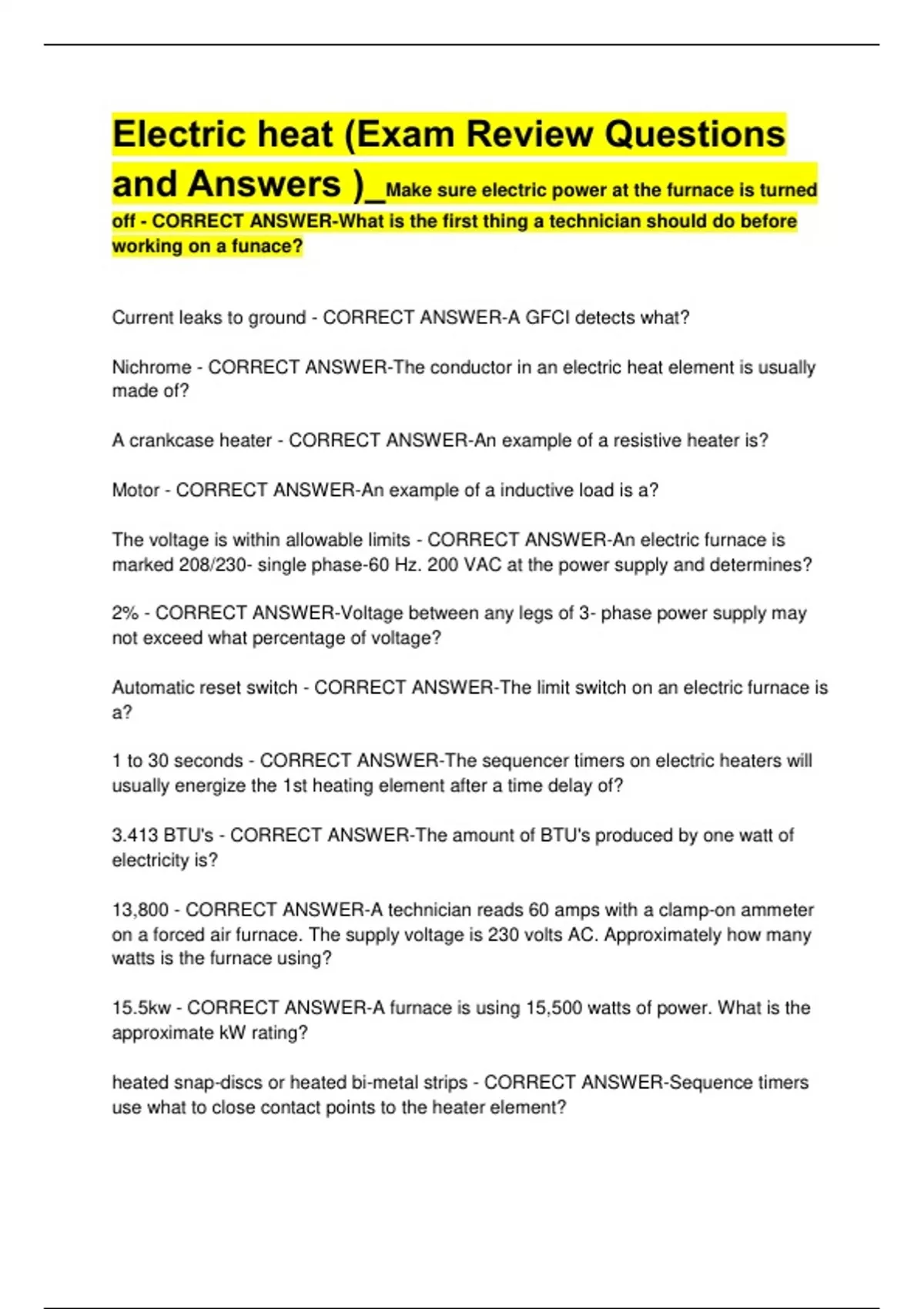 Electric heat (Exam Review Questions and Answers )_Make sure electric power at the furnace is turned off - CORRECT ANSWER-What is the first thing a technician should do before working on a funace? Current leaks to ground - CORRECT ANSWER-A GFCI detects what? Nichrome - CORRECT ANSWER-The conductor in an electric heat element is usually made of? A crankcase heater - CORRECT ANSWER-An example of a resistive heater is? Motor - CORRECT ANSWER-An example of a inductive load is a? The voltage is within allowable limits - CORRECT ANSWER-An electric furnace is marked 208/230- single phase-60 Hz. 200 VAC at the power supply and determines? 2% - CORRECT ANSWER-Voltage between any legs of 3- phase power supply may not exceed what percentage of voltage? Automatic reset switch - CORRECT ANSWER-The limit switch on an electric furnace is a? 1 to 30 seconds - CORRECT ANSWER-The sequencer timers on electric heaters will usually energize the 1st heating element after a time delay of? 3.413 BTU's - CORRECT ANSWER-The amount of BTU's produced by one watt of electricity is? 13,800 - CORRECT ANSWER-A technician reads 60 amps with a clamp-on ammeter on a forced air furnace. The supply voltage is 230 volts AC. Approximately how many watts is the furnace using? 15.5kw - CORRECT ANSWER-A furnace is using 15,500 watts of power. What is the approximate kW rating? heated snap-discs or heated bi-metal strips - CORRECT ANSWER-Sequence timers use what to close contact points to the heater element? Temperature - CORRECT ANSWER-An electric furnace heating thermostat must must open and close on the rise of? Series and adjustable - CORRECT ANSWER-A standard thermostat heat anticipatory is wired in what and can be what? Single transformer - CORRECT ANSWER-Some thermostat manufacturers require a "jumper" connection on the thermostat sub-base of heating and cooling thermostats in order to use a? Snap disc and fusible link - CORRECT ANSWER-Most electric heat elements use what kind of safeties to prevent overheating?