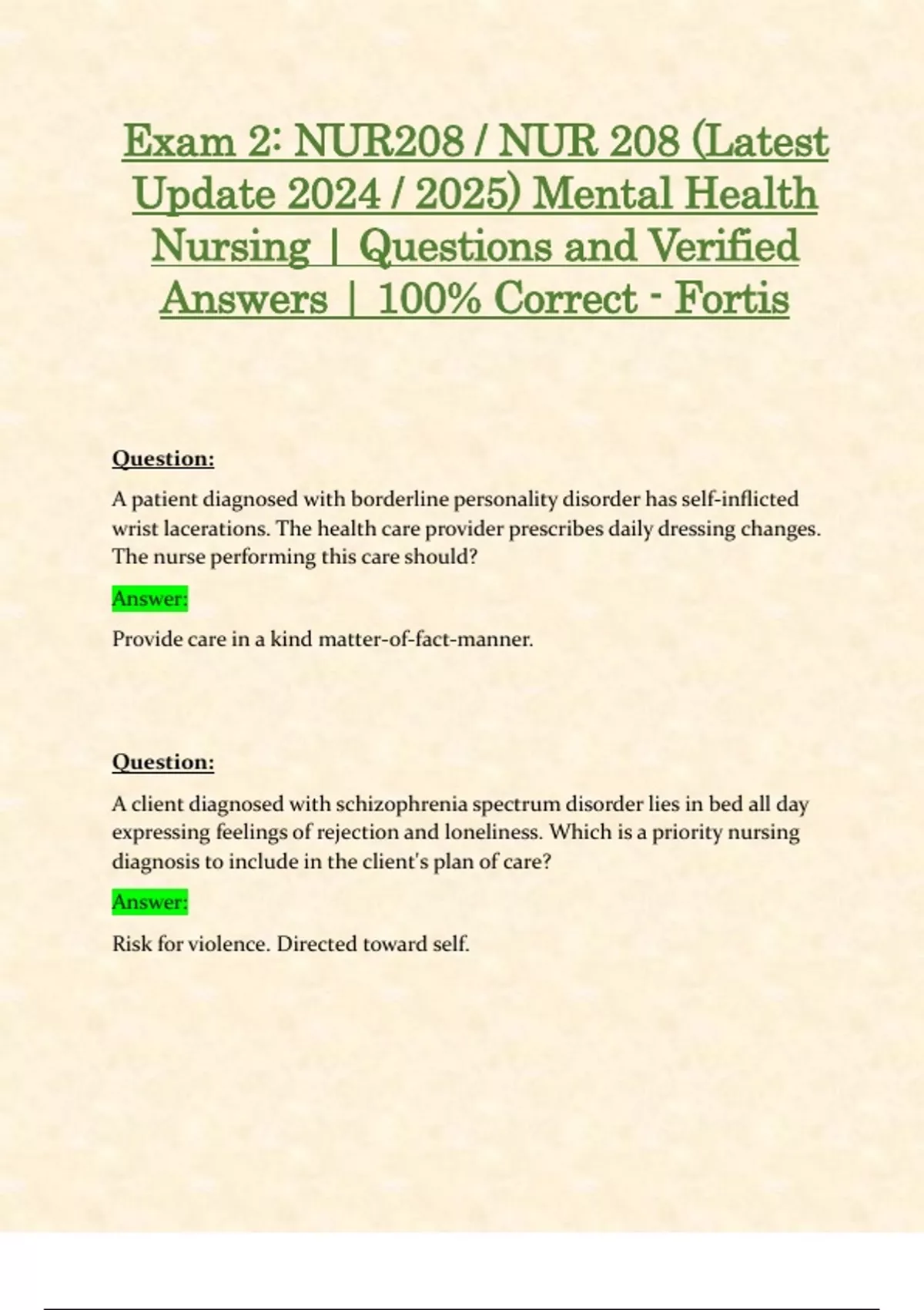 Exam 2: NUR208 / NUR 208 (Latest Update 2024 / 2025) Mental Health Nursing | Questions and Verified Answers | 100% Correct - Fortis