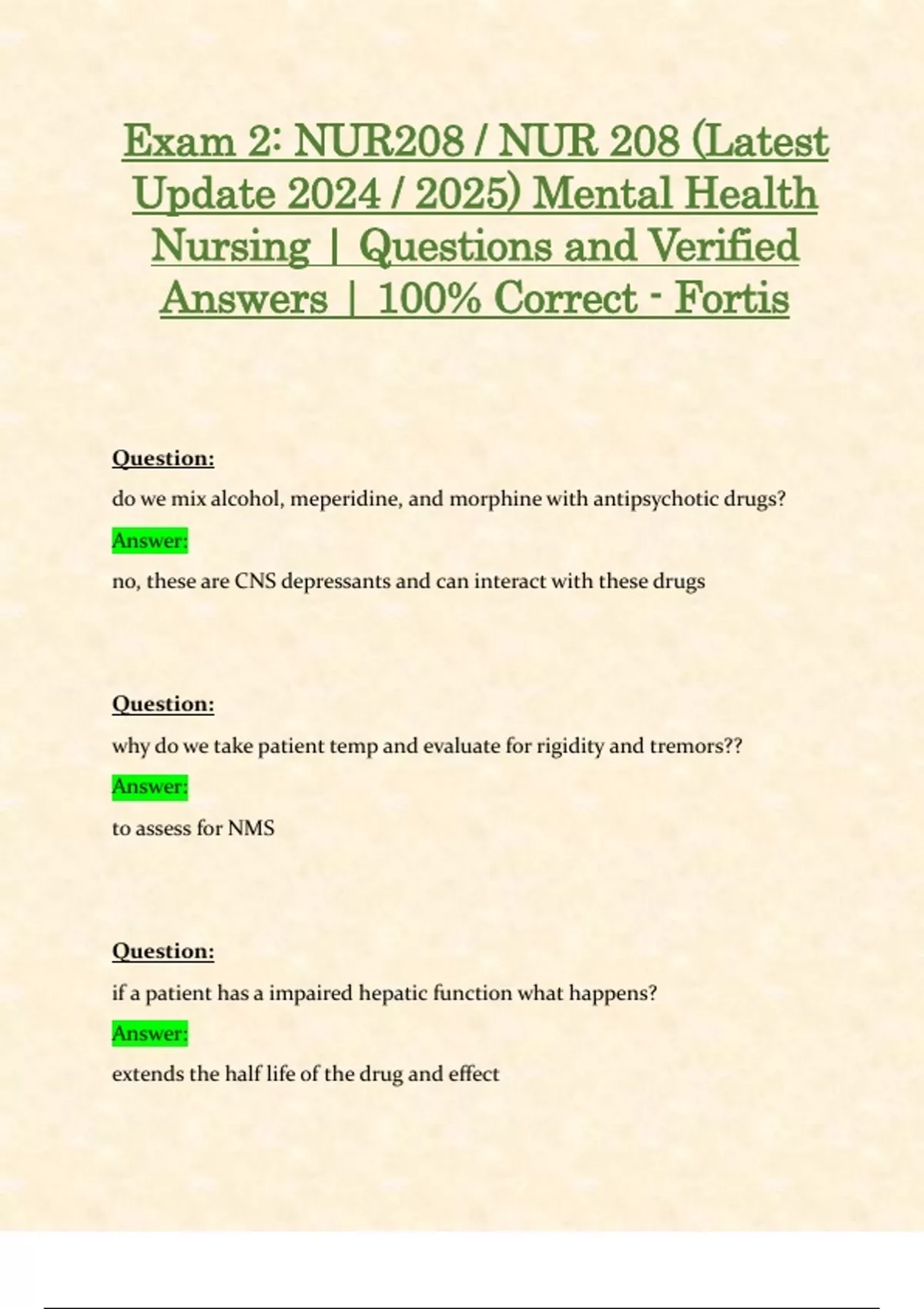Exam 2: NUR208 / NUR 208 (Latest Update 2024 / 2025) Mental Health Nursing | Questions and Verified Answers | 100% Correct - Fortis