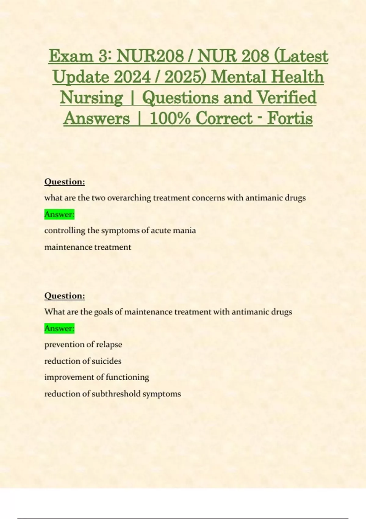 Exam 3: NUR208 / NUR 208 (Latest Update 2024 / 2025) Mental Health Nursing | Questions and Verified Answers | 100% Correct - Fortis