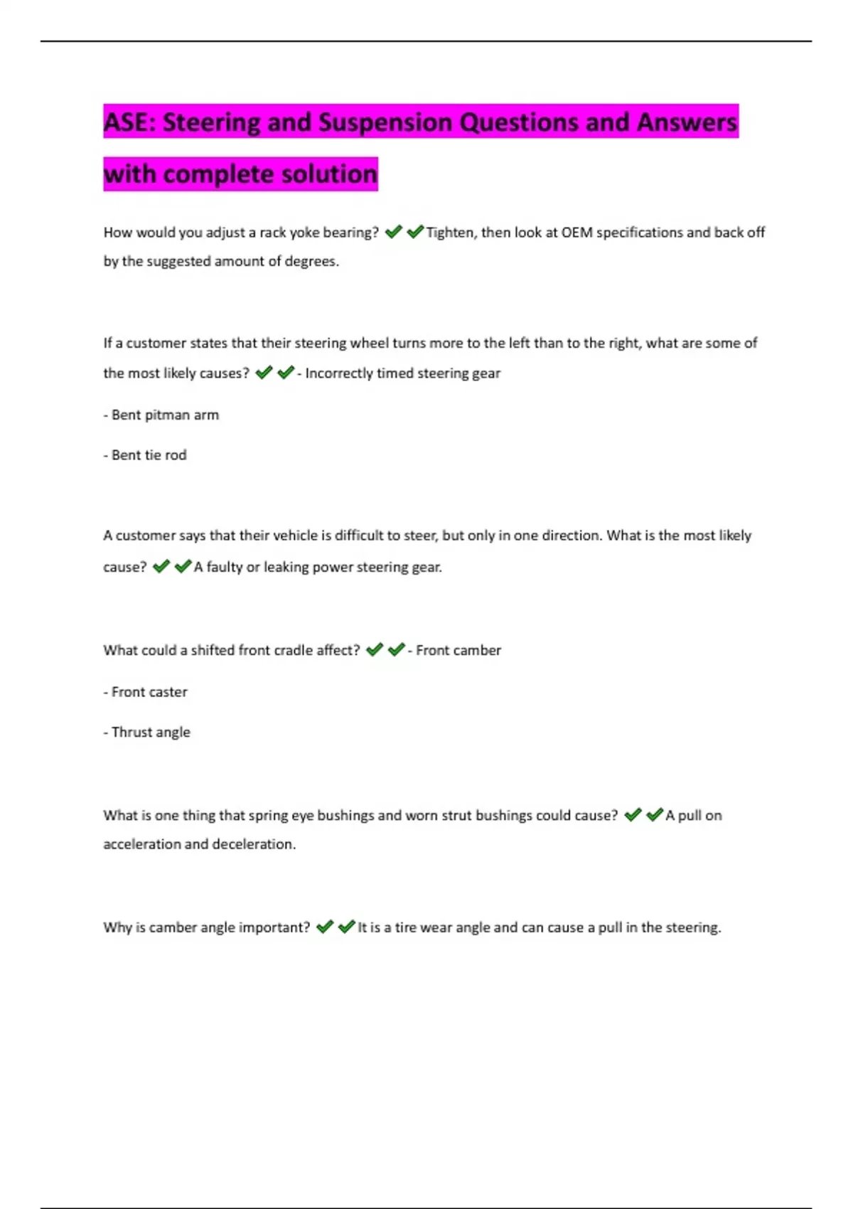 ASE: Steering and Suspension Questions and Answers with complete solution