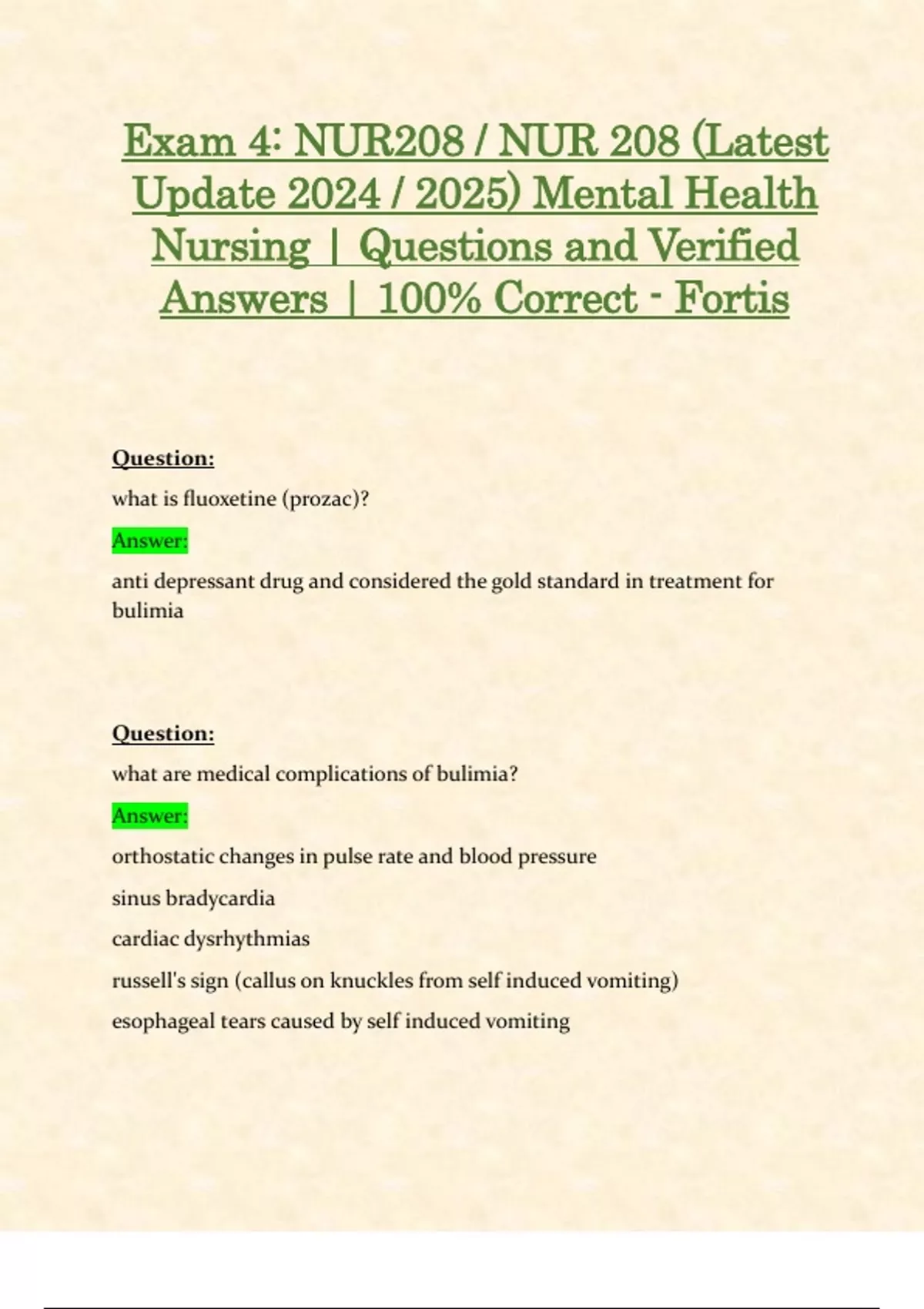 Exam 4: NUR208 / NUR 208 (Latest Update 2024 / 2025) Mental Health Nursing | Questions and Verified Answers | 100% Correct - Fortis