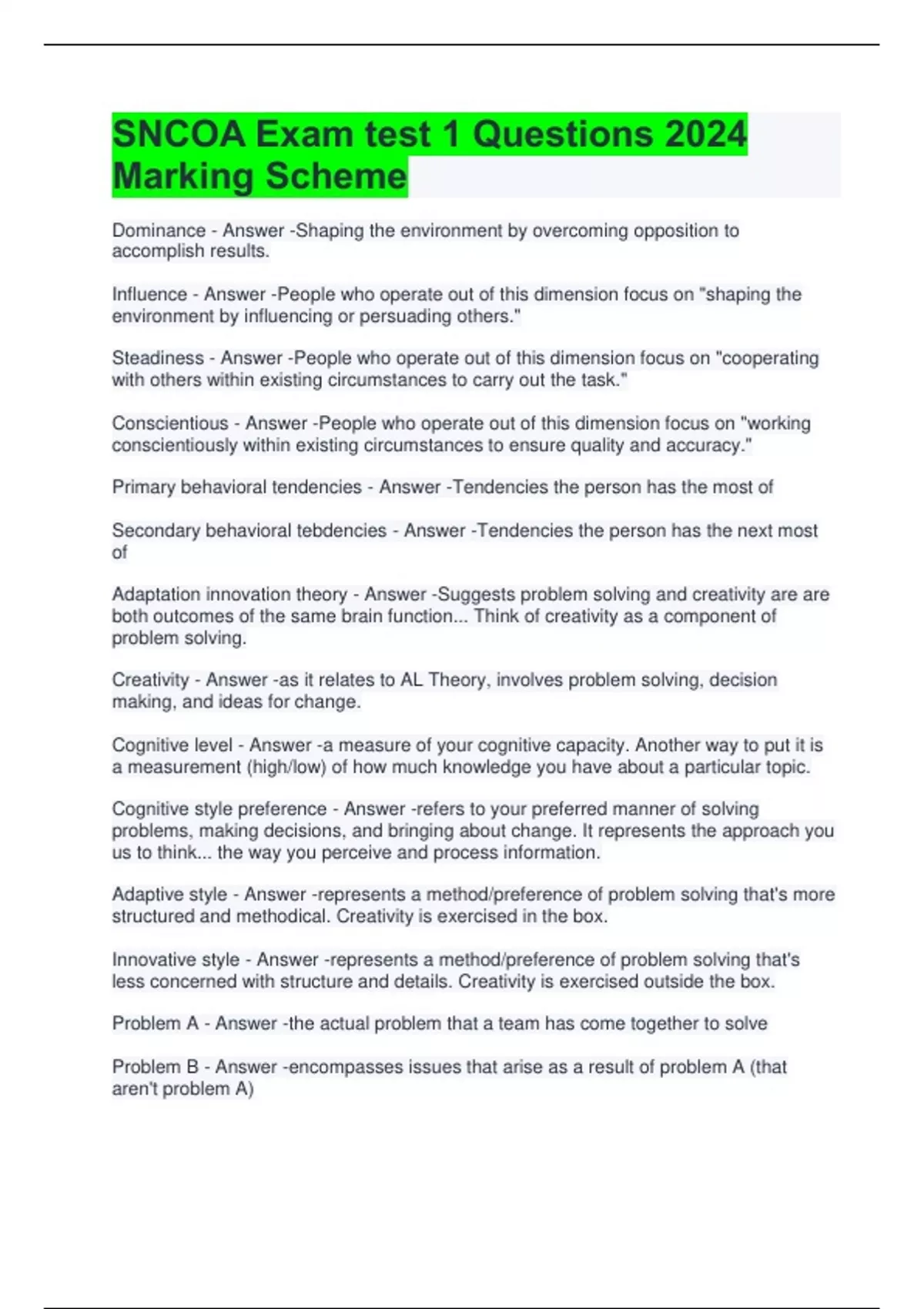 SNCOA Exam test 1 Questions 2024 Marking Scheme Dominance - Answer -Shaping the environment by overcoming opposition to accomplish results. Influence - Answer -People who operate out of this dimension focus on "shaping the environment by influencing or persuading others." Steadiness - Answer -People who operate out of this dimension focus on "cooperating with others within existing circumstances to carry out the task." Conscientious - Answer -People who operate out of this dimension focus on "working conscientiously within existing circumstances to ensure quality and accuracy." Primary behavioral tendencies - Answer -Tendencies the person has the most of Secondary behavioral tebdencies - Answer -Tendencies the person has the next most of Adaptation innovation theory - Answer -Suggests problem solving and creativity are are both outcomes of the same brain function... Think of creativity as a component of problem solving. Creativity - Answer -as it relates to AL Theory, involves problem solving, decision making, and ideas for change. Cognitive level - Answer -a measure of your cognitive capacity. Another way to put it is a measurement (high/low) of how much knowledge you have about a particular topic. Cognitive style preference - Answer -refers to your preferred manner of solving problems, making decisions, and bringing about change. It represents the approach you us to think... the way you perceive and process information. Adaptive style - Answer -represents a method/preference of problem solving that's more structured and methodical. Creativity is exercised in the box. Innovative style - Answer -represents a method/preference of problem solving that's less concerned with structure and details. Creativity is exercised outside the box. Problem A - Answer -the actual problem that a team has come together to solve Problem B - Answer -encompasses issues that arise as a result of problem A (that aren't problem A) Cognitive gaps - Answer -differences in cognitive style preferences
