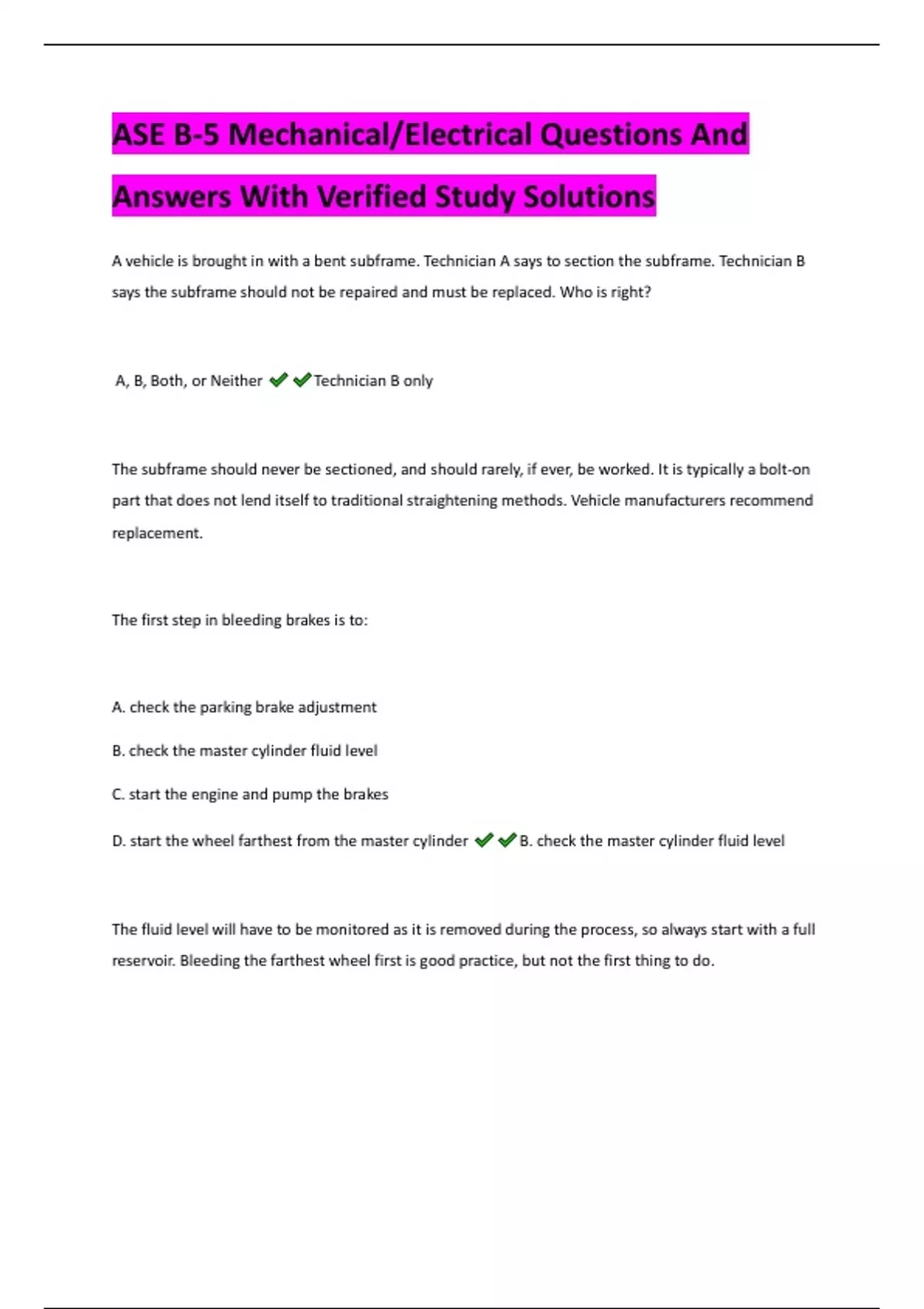 A vehicle is brought in with a bent subframe. Technician A says to section the subframe. Technician B says the subframe should not be repaired and must be replaced. Who is right? A, B, Both, or Neither Technician B only The subframe should never be sectioned, and should rarely, if ever, be worked. It is typically a bolt-on part that does not lend itself to traditional straightening methods. Vehicle manufacturers recommend replacement. The first step in bleeding brakes is to: A. check the parking brake adjustment B. check the master cylinder fluid level C. start the engine and pump the brakes D. start the wheel farthest from the master cylinder B. check the master cylinder fluid level