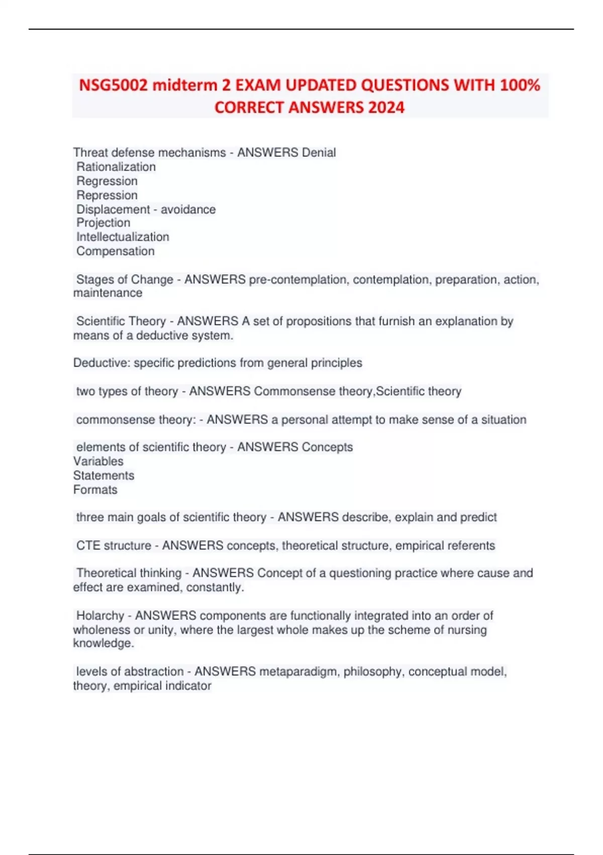 NSG5002 midterm 2 EXAM UPDATED QUESTIONS WITH 100% CORRECT ANSWERS 2024 Threat defense mechanisms - ANSWERS Denial Rationalization Regression Repression Displacement - avoidance Projection Intellectualization Compensation Stages of Change - ANSWERS pre-contemplation, contemplation, preparation, action, maintenance Scientific Theory - ANSWERS A set of propositions that furnish an explanation by means of a deductive system. Deductive: specific predictions from general principles two types of theory - ANSWERS Commonsense theory,Scientific theory commonsense theory: - ANSWERS a personal attempt to make sense of a situation elements of scientific theory - ANSWERS Concepts Variables Statements Formats three main goals of scientific theory - ANSWERS describe, explain and predict CTE structure - ANSWERS concepts, theoretical structure, empirical referents Theoretical thinking - ANSWERS Concept of a questioning practice where cause and effect are examined, constantly. Holarchy - ANSWERS components are functionally integrated into an order of wholeness or unity, where the largest whole makes up the scheme of nursing knowledge. levels of abstraction - ANSWERS metaparadigm, philosophy, conceptual model, theory, empirical indicator Four philosophical areas of inquiry - ANSWERS ontological (study of reality: what do we believe to be true) epistemological (study of knowledge), ethics (moral philosophy) logic (method of inquiry). philosophy - ANSWERS the love of knowledge Conceptual Model - ANSWERS characterize relationships of phenomena in a coherent format theories: - ANSWERS describe concepts and relationship between concepts Testing a theory - ANSWERS Deductive reasoning Top-Down Approach General principles leading to specific predictions Generating a theory - ANSWERS Inductive reasoning Down-Up Approach Specific observations leading to general rules Complex adaptive systems - ANSWERS A complex macroscopic collection of relatively similar and partially connected micro-structures formed in order to respond to a