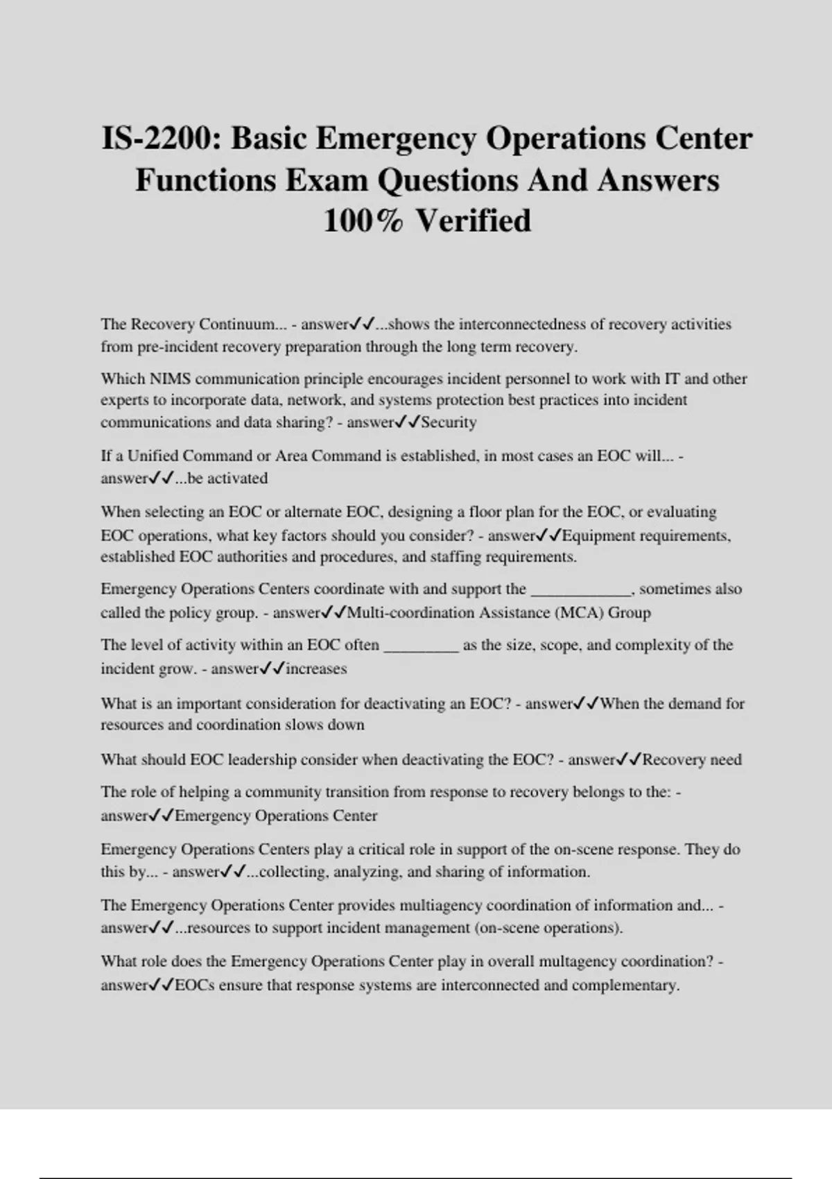 IS-2200: Basic Emergency Operations Center Functions Exam Questions And Answers 100% Verified The Recovery Continuum... - answer...shows the interconnectedness of recovery activities from pre-incident recovery preparation through the long term recovery. Which NIMS communication principle encourages incident personnel to work with IT and other experts to incorporate data, network, and systems protection best practices into incident communications and data sharing? - answerSecurity If a Unified Command or Area Command is established, in most cases an EOC will... - answer...be activated When selecting an EOC or alternate EOC, designing a floor plan for the EOC, or evaluating EOC operations, what key factors should you consider? - answerEquipment requirements, established EOC authorities and procedures, and staffing requirements. Emergency Operations Centers coordinate with and support the ____________, sometimes also called the policy group. - answerMulti-coordination Assistance (MCA) Group The level of activity within an EOC often _________ as the size, scope, and complexity of the incident grow. - answerincreases What is an important consideration for deactivating an EOC? - answerWhen the demand for resources and coordination slows down What should EOC leadership consider when deactivating the EOC? - answerRecovery need The role of helping a community transition from response to recovery belongs to the: - answerEmergency Operations Center Emergency Operations Centers play a critical role in support of the on-scene response. They do this by... - answer...collecting, analyzing, and sharing of information. The Emergency Operations Center provides multiagency coordination of information and... - answer...resources to support incident management (on-scene operations). What role does the Emergency Operations Center play in overall multagency coordination? - answerEOCs ensure that response systems are interconnected and complementary.