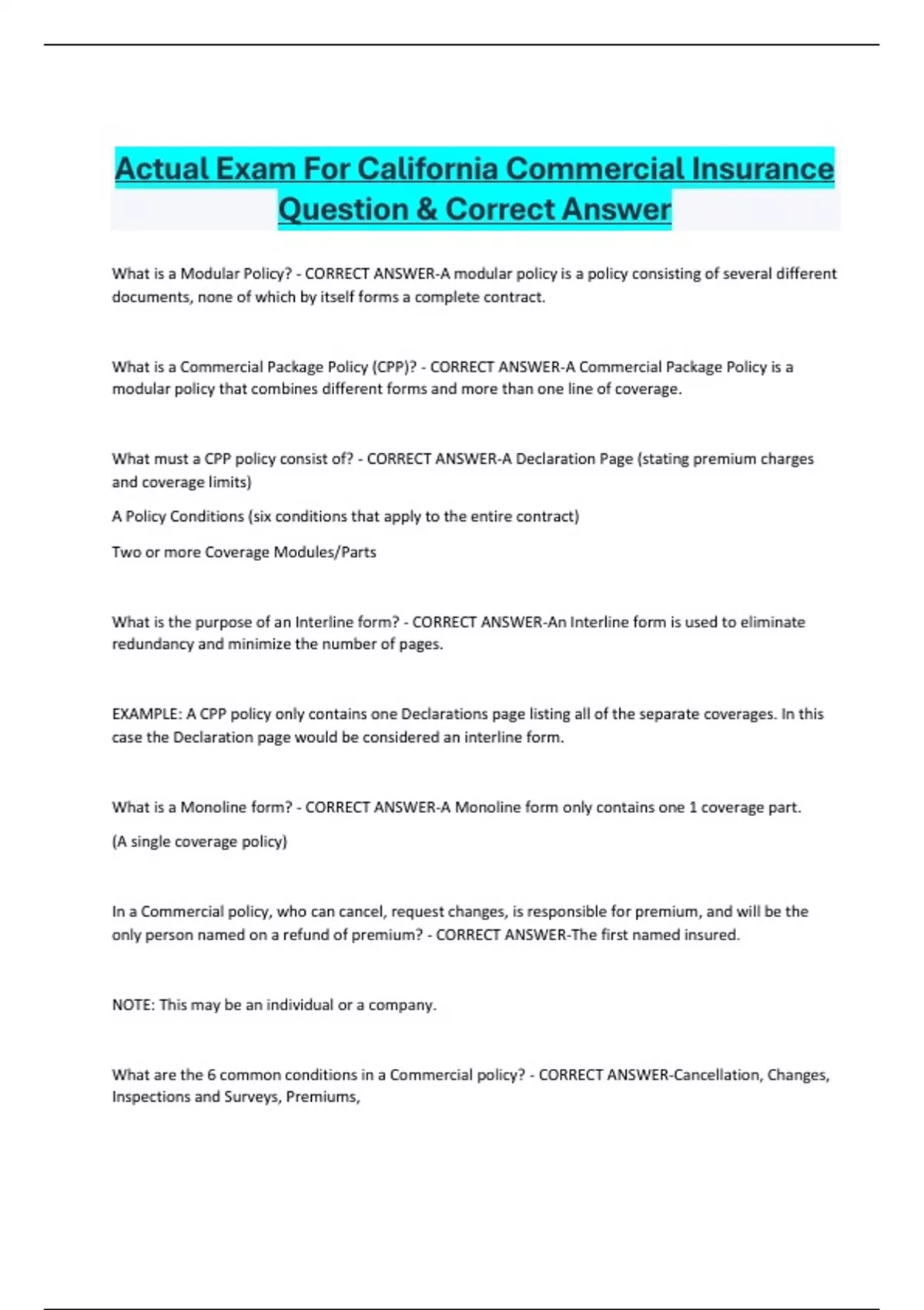 Actual Exam For California Commercial Insurance Question & Correct Answer What is a Modular Policy? - CORRECT ANSWER-A modular policy is a policy consisting of several different documents, none of which by itself forms a complete contract. What is a Commercial Package Policy (CPP)? - CORRECT ANSWER-A Commercial Package Policy is a modular policy that combines different forms and more than one line of coverage. What must a CPP policy consist of? - CORRECT ANSWER-A Declaration Page (stating premium charges and coverage limits) A Policy Conditions (six conditions that apply to the entire contract) Two or more Coverage Modules/Parts What is the purpose of an Interline form? - CORRECT ANSWER-An Interline form is used to eliminate redundancy and minimize the number of pages
