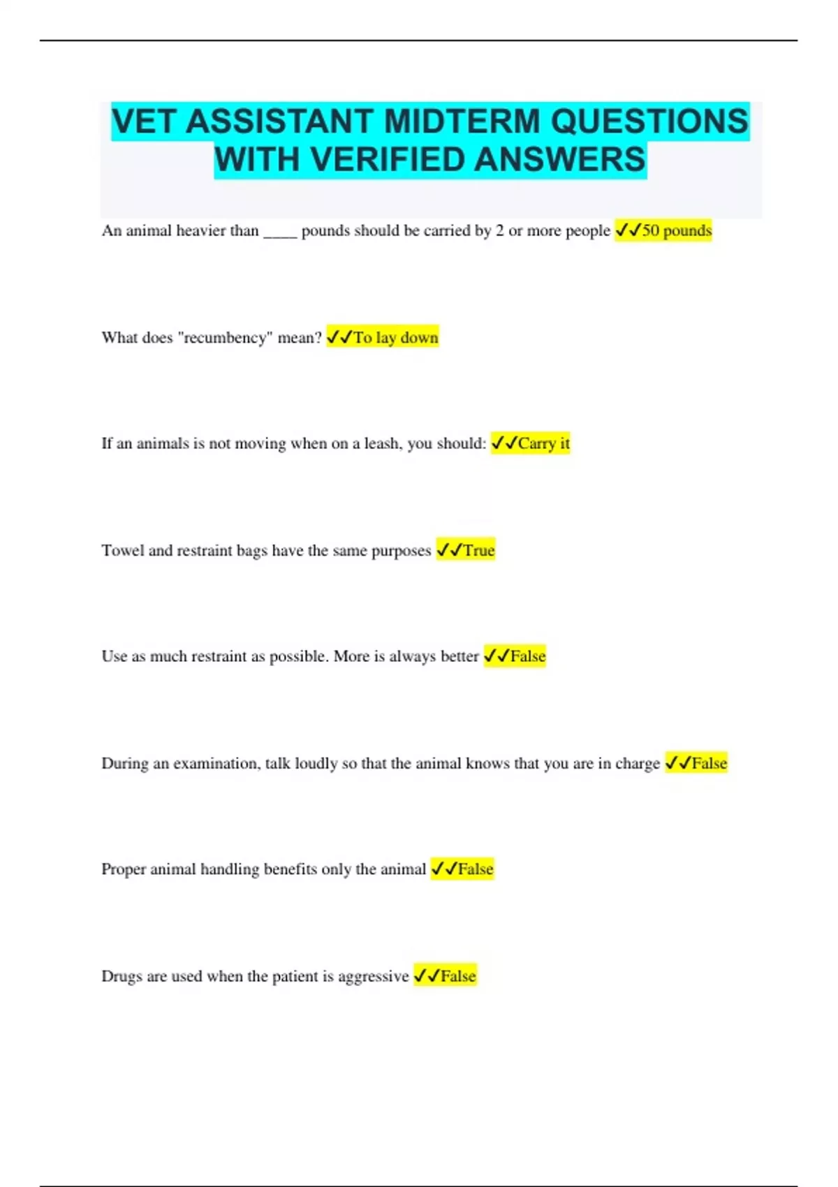 VET ASSISTANT MIDTERM QUESTIONS WITH VERIFIED ANSWERS An animal heavier than ____ pounds should be carried by 2 or more people 50 pounds What does "recumbency" mean? To lay down If an animals is not moving when on a leash, you should: Carry it Towel and restraint bags have the same purposes True Use as much restraint as possible. More is always better False During an examination, talk loudly so that the animal knows that you are in charge False Proper animal handling benefits only the animal False Drugs are used when the patient is aggressive False Gauze can be used as a muzzle True Fabric muzzles can be used for long periods of time True Name 3 ways infectious diseases are spread listed in the PPT Direct Transmission Indirect Transmission Vector Borne What is an example of a Vector Borne Disease Lyme Disease Disinfecting Surface Antiseptics Tissue Sterilizing Equipment When a bandage becomes soiled or wet, it needs to be removed or changed immediately? True The most common type of distal limb bandage
