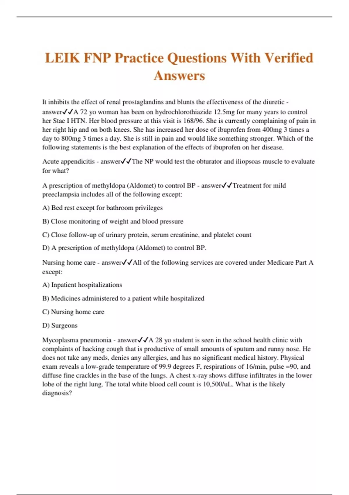LEIK FNP Practice Questions With Verified Answers It inhibits the effect of renal prostaglandins and blunts the effectiveness of the diuretic - answerA 72 yo woman has been on hydrochlorothiazide 12.5mg for many years to control her Stae I HTN. Her blood pressure at this visit is 168/96. She is currently complaining of pain in her right hip and on both knees. She has increased her dose of ibuprofen from 400mg 3 times a day to 800mg 3 times a day. She is still in pain and would like something stronger. Which of the following statements is the best explanation of the effects of ibuprofen on her disease. Acute appendicitis - answerThe NP would test the obturator and iliopsoas muscle to evaluate for what? A prescription of methyldopa (Aldomet) to control BP - answerTreatment for mild preeclampsia includes all of the following except: A) Bed rest except for bathroom privileges B) Close monitoring of weight and blood pressure C) Close follow-up of urinary protein, serum creatinine, and platelet count D) A prescription of methyldopa (Aldomet) to control BP. Nursing home care - answerAll of the following services are covered under Medicare Part A except: A) Inpatient hospitalizations B) Medicines administered to a patient while hospitalized C) Nursing home care D) Surgeons Mycoplasma pneumonia - answerA 28 yo student is seen in the school health clinic with complaints of hacking cough that is productive of small amounts of sputum and runny nose. He does not take any meds, denies any allergies, and has no significant medical history. Physical exam reveals a low-grade temperature of 99.9 degrees F, respirations of 16/min, pulse =90, and diffuse fine crackles in the base of the lungs. A chest x-ray shows diffuse infiltrates in the lower lobe of the right lung. The total white blood cell count is 10,500/uL. What is the likely diagnosis? 10mm - answerA 39 yo migrant worker presents to the clinic 2.5 days after a purified protein derivative (PPD) test. What minimum size of induration would be considered positive for this patient? The patient's spouse has the right to override the agent's decisions - answerAll of the following are correct statements regarding the role of the person named in a durable power of attorney except: A) The agent's decisions are legally binding B) The agent can make decisions in other areas of the patient's life such as financial issues. C) The agent can decide for the patient who is on life support when that life support can be terminated. D) The patient's spouse has the right to override the agent's decisions The patient has a medical illness that causes an anxiety reaction and denial - answerThe following statement regarding Munchausen syndrome is false: Beta-blockers - answerWhich antihypertensive medications should the NP avoid when treating patient with emphysema? Perform a complete and thorough history - answerA 30 y/o chef complains of pruritic hives over her chest and arms but denies difficulty breathing. She reports a family history of allergic rhinitis and asthma. What intervention is most appropriate? Edema of the face and upper extremities - answerWhich finding is most likely in young primigravidas with pregnancy induced hypertension? Tingling and numbness of both feet - answerWhich symptom is associated with B12 deficiency anemia? Order an ultrasound - answerA second triple screen on a 35 yo primigravida reveals abnormal low levels of the alpha fetoprotein and estriol and high levels of human chorionic gonadotropin. Which of the following interventions is the best choice for this patient? Chlamydia trachoma's - answerPts. diagnosed with gonorrhea should also be treated for what other infections? Osteoporosis - answerKyphosis is a late sign of Higher than normal - answerA 35 y/o primigravida who is at 28wks gestation is expecting twins. What would you would expect her alpha fetal protein (AFP) to be? Calcium channel blockers - answerWhich of the following antihypertensive medications has beneficial effects for an elderly white female with osteoporosis? Knee instability - answerThe Lachman maneuver is used to detect which of the following? Tanner Stage III - answerWhen an adolescent male's penis grows more in length than width, at which of the following Tanner stages is he classified? Toxoplasma gondii, other infections, rubella, cytomegalovirus and herpes - answerFetal TORCH infections can cause microcephaly, mental retardation, hepatosplenomegaly, and intrauterine growth retardation. The acronym for TORCH stands for:. Laryngeal neoplasia - answerHPV infection of the larynx has been associated with: Degenerative joint disease - answerMr. Brown is a 65 y/o carpenter complaining of morning stiffness and pain in both his hands and right knee upon awakening. He feels some relief after warming up. On exam, the nurse notices the presence of Heberden's nodes. What is most likely diagnosis? Instability of the knee - answerWhat does the positive posterior drawer sign in a 10 yr old soccer player signify? From 33-35 cm - answerA multigravida who is at 34 wks gestation wants to know at what level her uterine funds should be. The best answer is to advise the mother that her funds is: Advise mother that her pregnancy is progressing well - answerA multigravida who is 28wks gestation has a fundal height of 29cm. What is the best recommendation for this patient? Creatinine - answerWhich laboratory test is used in primary care to evaluate renal function? Chronic intake of non steroidal anti-inflammatory drugs (NSAIDs) can cause the disorder - answerAll of the following are false statements regarding acute gastritis except: A) Chronic intake of non steroidal anti-inflammatory drugs (NSAIDs) can cause the disorder B) Chronic lack of dietary fiber is the main cause of the disorder C) The screening rest for the disorder is the barium swallow test D) The gold standard to evaluate the disorder is a colonoscopy. Apraxia and fatigue - answerSigns and symptoms of depression do not include: