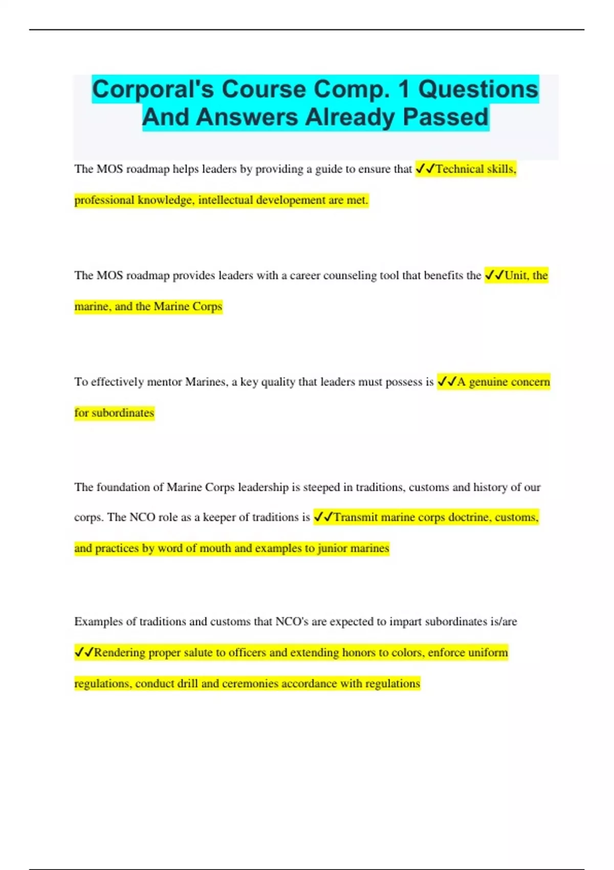Corporal's Course Comp. 1 Questions And Answers Already Passed The MOS roadmap helps leaders by providing a guide to ensure that Technical skills, professional knowledge, intellectual developement are met. The MOS roadmap provides leaders with a career counseling tool that benefits the Unit, the marine, and the Marine Corps To effectively mentor Marines, a key quality that leaders must possess is A genuine concern for subordinates The foundation of Marine Corps leadership is steeped in traditions, customs and history of our corps. The NCO role as a keeper of traditions is Transmit marine corps doctrine, customs, and practices by word of mouth and examples to junior marines Examples of traditions and customs that NCO's are expected to impart subordinates is/are Rendering proper salute to officers and extending honors to colors, enforce uniform regulations, conduct drill and ceremonies accordance with regulations The nature of our profession has associated stressors. Leaders must be able to recognize change's in a Marine's _______________ due to exposure to lethal force and it's aftermath Physical or mental functioning and behavior Leaders who identify Marines with combat and operational stress problems should refer marines to OSCAR mentors Leaders at any level can support the combat and operational stress control program (COSC) by Minimizing stress problems and eliminating the stigma associated with seeking help Our character or ethos has been shaped throughout history not just by doctrine but also by The action of ordinary men and women before us As leaders of Marines our primary responsibility to the American people is Instill a warrior first mentality that fights and wins wars Our character has been built on the leadership philosophy that describes marines as "different." Marines demonstrate this philosophy Through military appearance, through strict obedience to order and disciplined behavior, adherence to traditional standards What does the phrase "every marine is a rifle man" mean There are no "rear area" marines in expeditionary operations, so the principle of an infantry marine apply to all marines even those in support roles Effective leadership depends on the moral examples set by the leader, not only as a warfighter but as a _________ and _________ Citizen/ human being In combat or peacetime, leaders demonstrate __________ by making