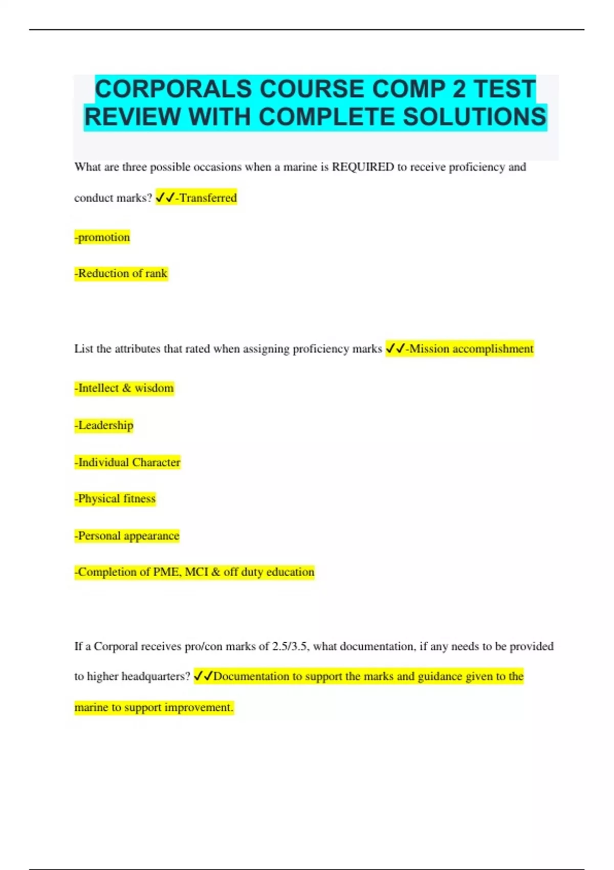 CORPORALS COURSE COMP 2 TEST REVIEW WITH COMPLETE SOLUTIONS What are three possible occasions when a marine is REQUIRED to receive proficiency and conduct marks? -Transferred -promotion -Reduction of rank List the attributes that rated when assigning proficiency marks -Mission accomplishment -Intellect & wisdom -Leadership -Individual Character -Physical fitness -Personal appearance -Completion of PME, MCI & off duty education If a Corporal receives pro/con marks of 2.5/3.5, what documentation, if any needs to be provided to higher headquarters? Documentation to support the marks and guidance given to the marine to support improvement. True or False? The IRAM provides guidance for two areas of focus when recommending proficiency marks False List the three areas of focus when recommending proficiency and conduct marks -Occasion -Attributes -Rating scale What is the definition of reliability as it relates to the attributes of conduct? To conduct yourself properly without supervision What is the definition of a culture group? A group of people whose common world views unites them in a social structure and shared behavior. What type of discharge upon separation would you rate if your average pro/cons were 3.0/4.0? Honorable Define the goal of the Marine Corps promotion system To promote the most qualified marines How often are composite scores for your MOS computed Quarterly Promotions are a reflection of what? Future